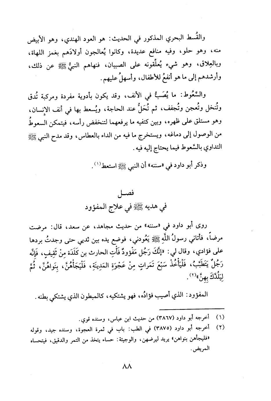 رَوَى أبو داود فِي " سُنَنِهِ " مِنْ حَدِيثِ مجاهد عَنْ سعد، قَالَ: ( «مَرِضْتُ مَرَضًا فَأَتَانِي رَسُولُ اللَّهِ صَلَّى اللَّهُ عَلَيْهِ وَسَلَّمَ يَعُودُنِي، فَوَضَعَ يَدَهُ بَيْنَ ثَدْيَيَّ حَتَّى وَجَدْتُ بَرْدَهَا عَلَى فُؤَادِي، وَقَالَ لِي: " إِنَّكَ رَجُلٌ مَفْئُودٌ فَأْتِ الحارث بن كلدة مِنْ ثَقِيفٍ، فَإِنَّهُ رَجُلٌ يَتَطَبَّبُ، فَلْيَأْخُذْ سَبْعَ تَمَرَاتٍ مِنْ عَجْوَةِ الْمَدِينَةِ، فَلْيَجَأْهُنَّ بِنَوَاهُنَّ، ثُمَّ لِيَلُدَّكَ بِهِنَّ» )