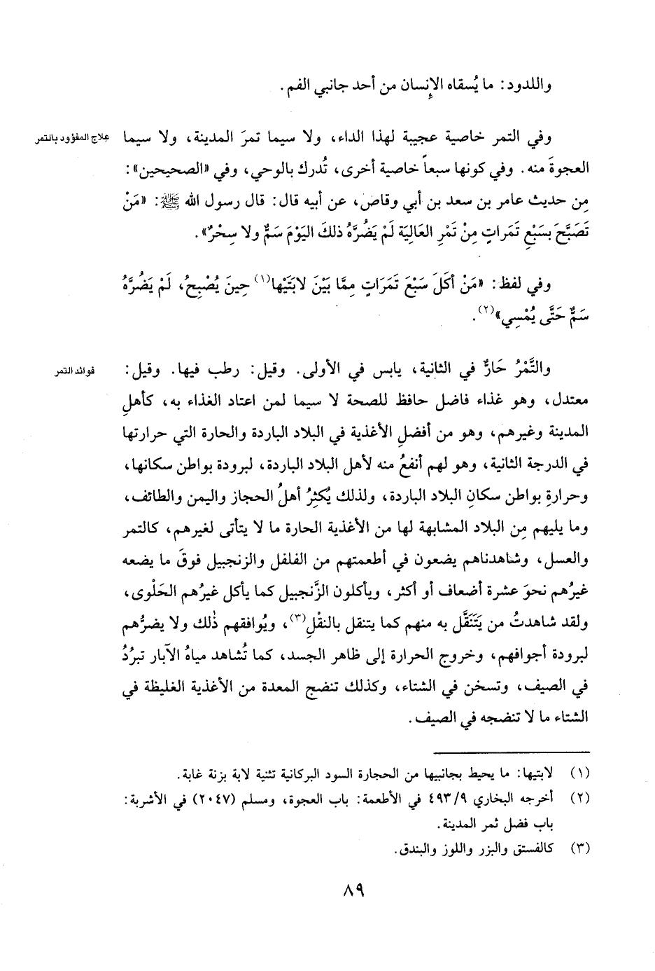 وَالتَّمْرُ حَارٌّ فِي الثَّانِيَةِ، يَابِسٌ فِي الْأُولَى. وَقِيلَ: رَطْبٌ فِيهَا. وَقِيلَ: مُعْتَدِلٌ، وَهُوَ غِذَاءٌ فَاضِلٌ حَافِظٌ لِلصِّحَّةِ لَا سِيَّمَا لِمَنِ اعْتَادَ الْغِذَاءَ بِهِ، كَأَهْلِ الْمَدِينَةِ وَغَيْرِهِمْ، وَهُوَ مِنْ أَفْضَلِ الْأَغْذِيَةِ فِي الْبِلَادِ الْبَارِدَةِ وَالْحَارَّةِ الَّتِي حَرَارَتُهَا فِي الدَّرَجَةِ الثَّانِيَةِ، وَهُوَ لَهُمْ أَنْفَعُ مِنْهُ لِأَهْلِ الْبِلَادِ الْبَارِدَةِ؛ لِبُرُودَةِ بَوَاطِنِ سُكَّانِهَا، وَحَرَارَةِ بَوَاطِنِ سُكَّانِ الْبِلَادِ الْبَارِدَةِ؛ وَلِذَلِكَ يُكْثِرُ أَهْلُ الْحِجَازِ وَالْيَمَنِ وَالطَّائِفِ وَمَا يَلِيهِمْ مِنَ الْبِلَادِ الْمُشَابِهَةِ لَهَا مِنَ الْأَغْذِيَةِ الْحَارَّةِ مَا لَا يَتَأَتَّى لِغَيْرِهِمْ، كَالتَّمْرِ وَالْعَسَلِ، وَشَاهَدْنَاهُمْ يَضَعُونَ فِي أَطْعِمَتِهِمْ مِنَ الْفُلْفُلِ وَالزَّنْجَبِيلِ فَوْقَ مَا يَضَعُهُ غَيْرُهُمْ نَحْوَ عَشَرَةِ أَضْعَافٍ أَوْ أَكْثَرَ، وَيَأْكُلُونَ الزَّنْجَبِيلَ كَمَا يَأْكُلُ غَيْرُهُمُ الْحَلْوَى، وَلَقَدْ شَاهَدْتُ مَنْ يَتَنَقَّلُ بِهِ مِنْهُمْ كَمَا يَتَنَقَّلُ بِالنَّقْلِ، وَيُوَافِقُهُمْ ذَلِكَ وَلَا يَضُرُّهُمْ لِبُرُودَةِ أَجْوَافِهِمْ، وَخُرُوجِ الْحَرَارَةِ إِلَى ظَاهِرِ الْجَسَدِ، كَمَا تُشَاهَدُ مِيَاهُ الْآبَارِ تَبْرُدُ فِي الصَّيْفِ، وَتَسْخَنُ فِي الشِّتَاءِ، وَكَذَلِكَ تُنْضِجُ الْمَعِدَةُ مِنَ الْأَغْذِيَةِ الْغَلِيظَةِ فِي الشِّتَاءِ مَا لَا تُنْضِجُهُ فِي الصَّيْفِ.