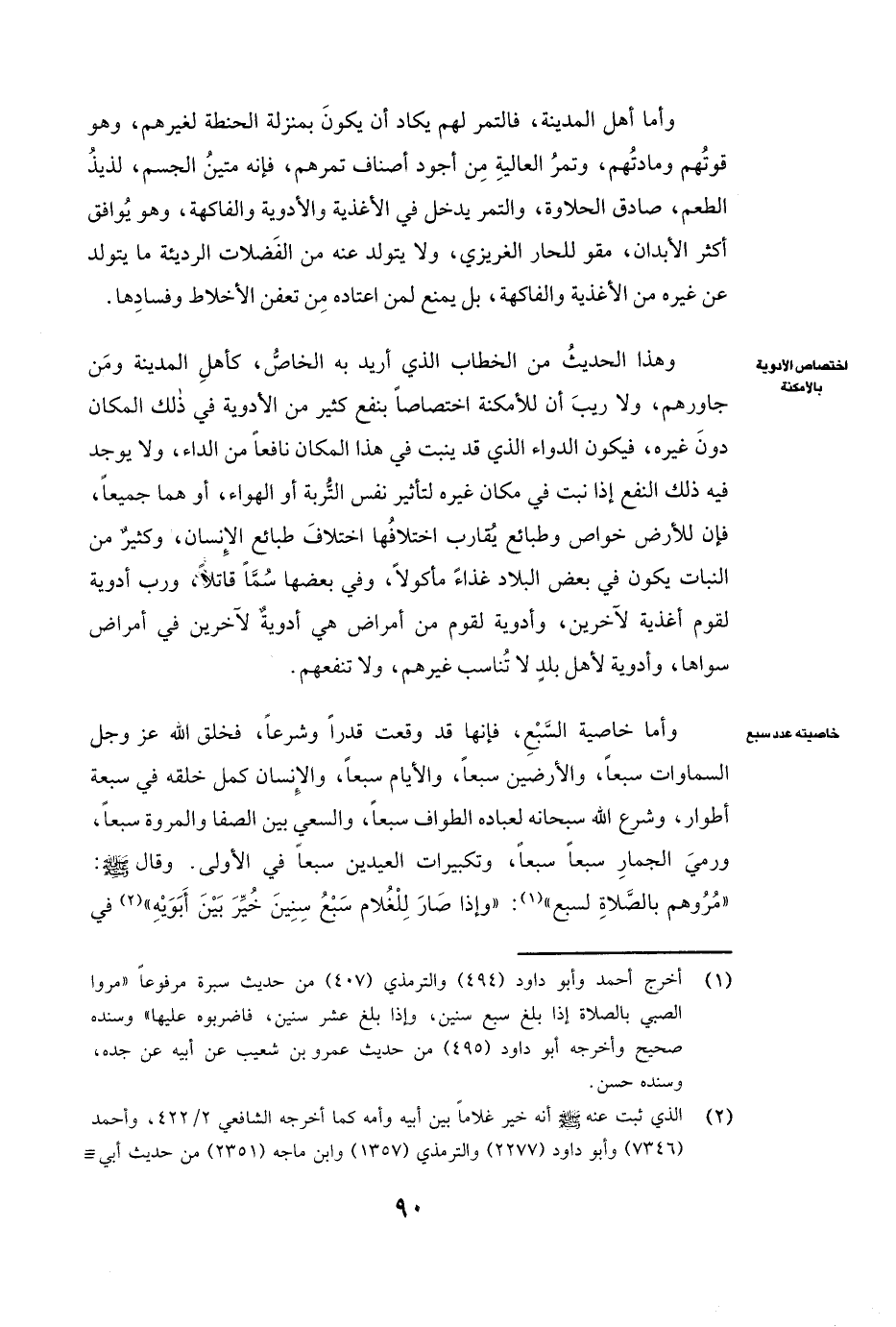وَهَذَا الْحَدِيثُ مِنَ الْخِطَابِ الَّذِي أُرِيدَ بِهِ الْخَاصُّ، كَأَهْلِ الْمَدِينَةِ وَمَنْ جَاوَرَهُمْ، وَلَا رَيْبَ أَنَّ لِلْأَمْكِنَةِ اخْتِصَاصًا بِنَفْعِ كَثِيرٍ مِنَ الْأَدْوِيَةِ فِي ذَلِكَ الْمَكَانِ دُونَ غَيْرِهِ، فَيَكُونُ الدَّوَاءُ الَّذِي قَدْ يَنْبُتُ فِي هَذَا الْمَكَانِ نَافِعًا مِنَ الدَّاءِ، وَلَا يُوجَدُ فِيهِ ذَلِكَ النَّفْعُ إِذَا نَبَتَ فِي مَكَانٍ غَيْرِهِ لِتَأْثِيرِ نَفْسِ التُّرْبَةِ أَوِ الْهَوَاءِ، أَوْ هُمَا جَمِيعًا، فَإِنَّ لِلْأَرْضِ خَوَاصًّا وَطَبَائِعَ يُقَارِبُ اخْتِلَافُهَا اخْتِلَافَ طَبَائِعِ الْإِنْسَانِ، وَكَثِيرٌ مِنَ النَّبَاتِ يَكُونُ فِي بَعْضِ الْبِلَادِ غِذَاءً مَأْكُولًا، وَفِي بَعْضِهَا سَمَّا قَاتِلًا، وَرُبَّ أَدْوِيَةٍ لِقَوْمٍ أَغْذِيَةٌ لِآخَرِينَ، وَأَدْوِيَةٍ لِقَوْمٍ مِنْ أَمْرَاضٍ هِيَ أَدْوِيَةٌ لِآخَرِينَ فِي أَمْرَاضٍ سِوَاهَا، وَأَدْوِيَةٍ لِأَهْلِ بَلَدٍ لَا تُنَاسِبُ غَيْرَهُمْ، وَلَا تَنْفَعُهُمْ