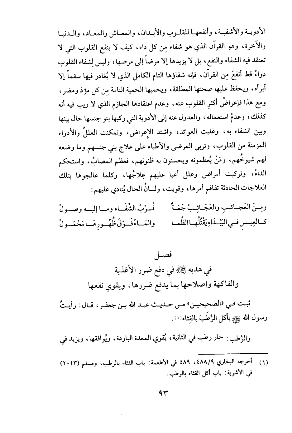الْأَدْوِيَةِ وَالْأَشْفِيَةِ، وَأَنْفَعِهَا لِلْقُلُوبِ وَالْأَبْدَانِ، وَالْمَعَاشِ وَالْمَعَادِ وَالدُّنْيَا وَالْآخِرَةِ، وَهُوَ الْقُرْآنُ الَّذِي هُوَ شِفَاءٌ مِنْ كُلِّ دَاءٍ، كَيْفَ لَا يَنْفَعُ الْقُلُوبَ الَّتِي لَا تَعْتَقِدُ فِيهِ الشِّفَاءَ وَالنَّفْعَ، بَلْ لَا يَزِيدُهَا إِلَّا مَرَضًا إِلَى مَرَضِهَا، وَلَيْسَ لِشِفَاءِ الْقُلُوبِ دَوَاءٌ قَطُّ أَنْفَعُ مِنَ الْقُرْآنِ، فَإِنَّهُ شِفَاؤُهَا التَّامُّ الْكَامِلُ الَّذِي لَا يُغَادِرُ فِيهَا سَقَمًا إِلَّا أَبْرَأَهُ، وَيَحْفَظُ عَلَيْهَا صِحَّتَهَا الْمُطْلَقَةَ، وَيَحْمِيهَا الْحَمِيَّةَ التَّامَّةَ مِنْ كُلِّ مُؤْذٍ وَمُضِرٍّ، وَمَعَ هَذَا فَإِعْرَاضُ أَكْثَرِ الْقُلُوبِ عَنْهُ، وَعَدَمُ اعْتِقَادِهَا الْجَازِمِ الَّذِي لَا رَيْبَ فِيهِ أَنَّهُ كَذَلِكَ، وَعَدَمُ اسْتِعْمَالِهِ وَالْعُدُولُ عَنْهُ إِلَى الْأَدْوِيَةِ الَّتِي رَكَّبَهَا بَنُو جِنْسِهَا حَالَ بَيْنَهَا وَبَيْنَ الشِّفَاءِ بِهِ، وَغَلَبَتِ الْعَوَائِدُ وَاشْتَدَّ الْإِعْرَاضُ وَتَمَكَّنَتِ الْعِلَلُ وَالْأَدْوَاءُ الْمُزْمِنَةُ مِنَ الْقُلُوبِ، وَتَرَبَّى الْمَرْضَى وَالْأَطِبَّاءُ عَلَى عِلَاجِ بَنِي جِنْسِهِمْ وَمَا وَضَعَهُ لَهُمْ شُيُوخُهُمْ، وَمَنْ يُعَظِّمُونَهُ وَيُحْسِنُونَ بِهِ ظُنُونَهُمْ، فَعَظُمَ الْمُصَابُ، وَاسْتَحْكَمَ الدَّاءُ، وَتَرَكَّبَتْ أَمْرَاضٌ وَعِلَلٌ أَعْيَا عَلَيْهِمْ عِلَاجُهَا، وَكُلَّمَا عَالَجُوهَا بِتِلْكَ الْعِلَاجَاتِ الْحَادِثَةِ تَفَاقَمَ أَمْرُهَا، وَقَوِيَتْ، وَلِسَانُ الْحَالِ يُنَادِي عَلَيْهِمْ: