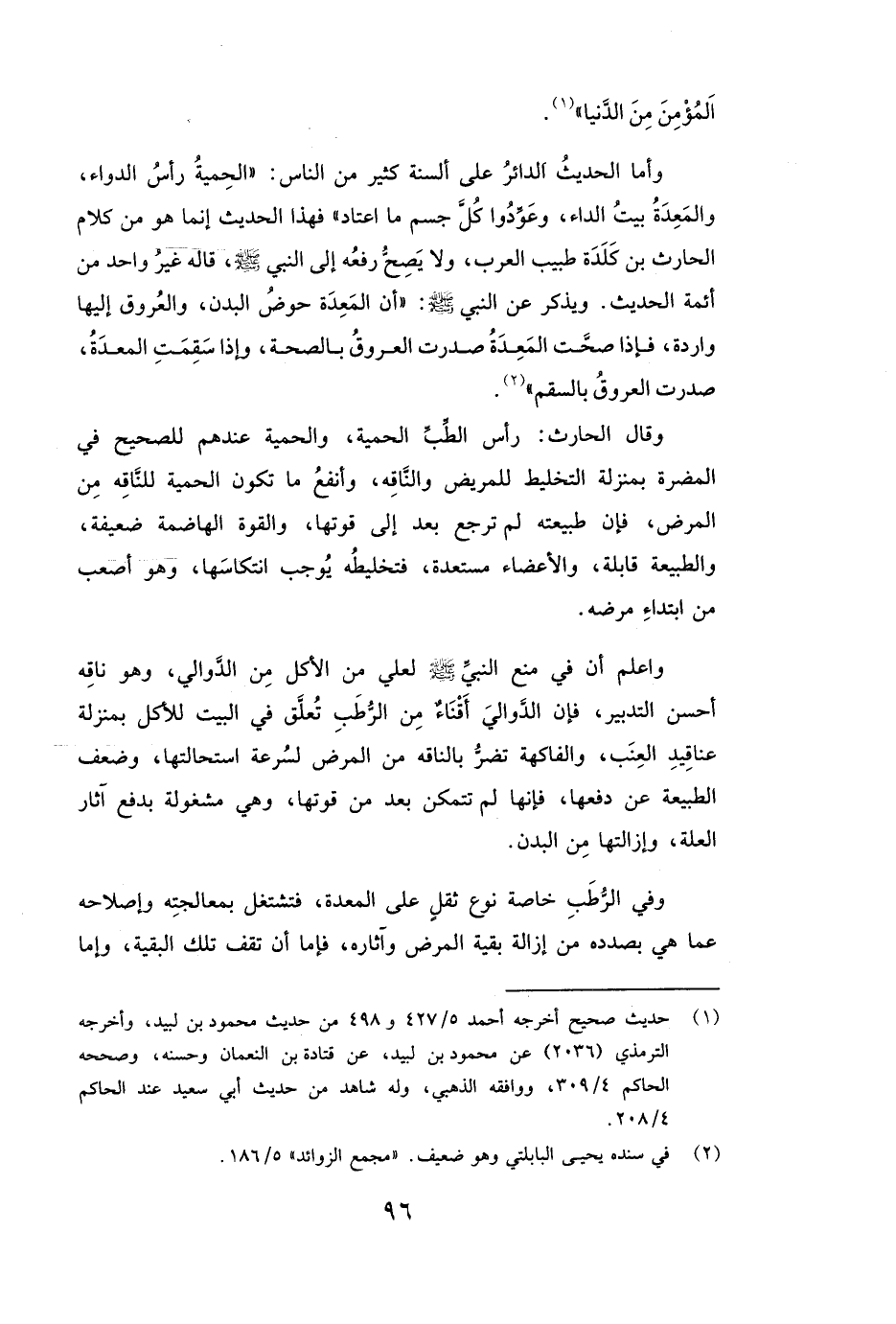 وَأَمَّا الْحَدِيثُ الدَّائِرُ عَلَى أَلْسِنَةِ كَثِيرٍ مِنَ النَّاسِ: ( «الْحِمْيَةُ رَأْسُ الدَّوَاءِ، وَالْمَعِدَةُ بَيْتُ الدَّاءِ، وَعَوِّدُوا كُلَّ جِسْمٍ مَا اعْتَادَ» ) فَهَذَا الْحَدِيثُ إِنَّمَا هُوَ مِنْ كَلَامِ الحارث بن كلدة طَبِيبِ الْعَرَبِ، وَلَا يَصِحُّ رَفْعُهُ إِلَى النَّبِيِّ صَلَّى اللَّهُ عَلَيْهِ وَسَلَّمَ، قَالَهُ غَيْرُ وَاحِدٍ مِنْ أَئِمَّةِ الْحَدِيثِ.
