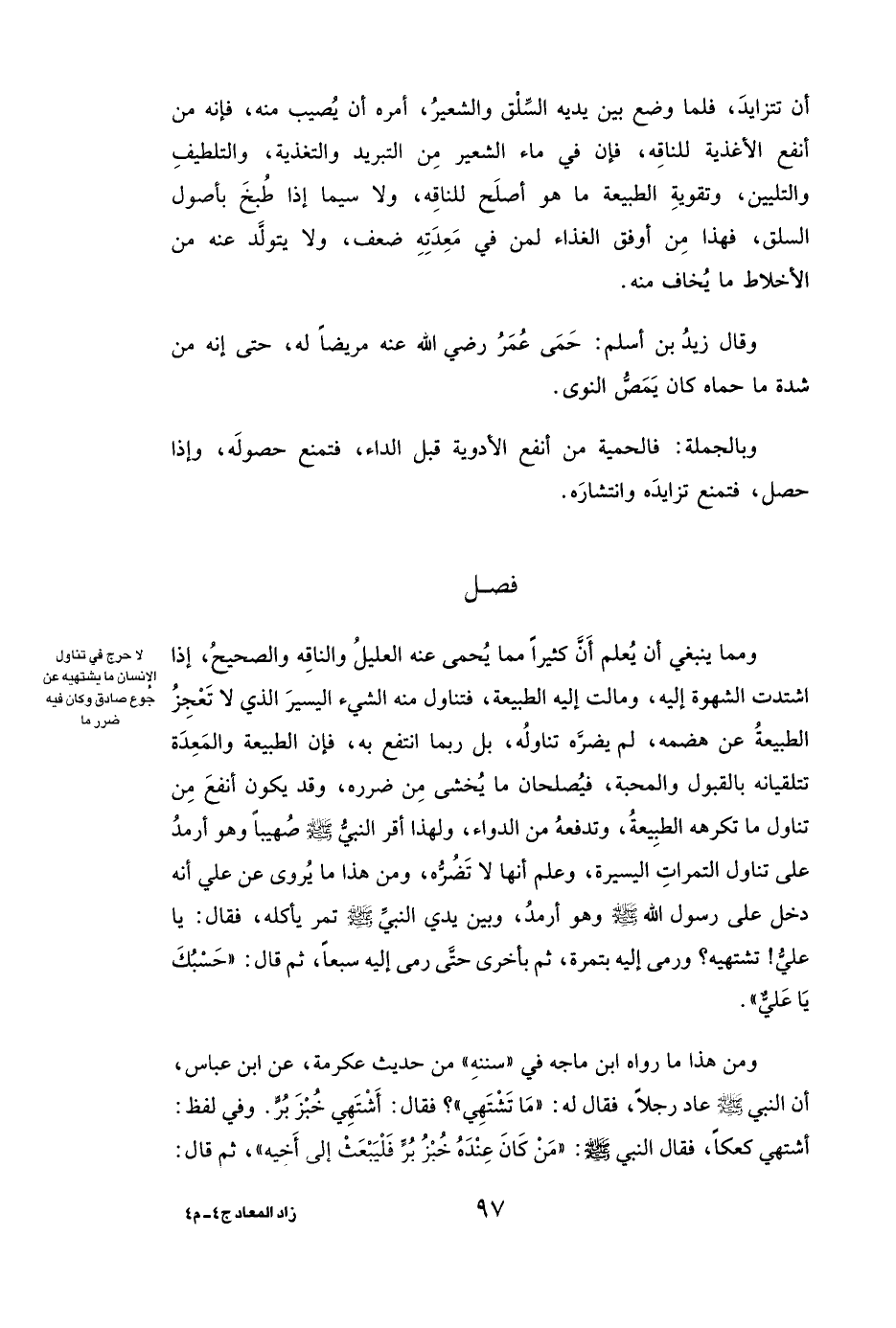 فَصْلٌ وَمِمَّا يَنْبَغِي أَنْ يُعْلَمَ أَنَّ كَثِيرًا مِمَّا يُحْمَى عَنْهُ الْعَلِيلُ وَالنَّاقِهُ وَالصَّحِيحُ، إِذَا اشْتَدَّتِ الشَّهْوَةُ إِلَيْهِ، وَمَالَتْ إِلَيْهِ الطَّبِيعَةُ، فَتَنَاوَلَ مِنْهُ الشَّيْءَ الْيَسِيرَ الَّذِي لَا تَعْجِزُ الطَّبِيعَةُ عَنْ هَضْمِهِ، لَمْ يَضُرَّهُ تَنَاوُلُهُ، بَلْ رُبَّمَا انْتَفَعَ بِهِ، فَإِنَّ الطَّبِيعَةَ وَالْمَعِدَةَ تَتَلَقَّيَانِهِ بِالْقَبُولِ وَالْمَحَبَّةِ، فَيُصْلِحَانِ مَا يُخْشَى مِنْ ضَرَرِهِ، وَقَدْ يَكُونُ أَنْفَعَ مِنْ تَنَاوُلِ مَا تَكْرَهُهُ الطَّبِيعَةُ، وَتَدْفَعُهُ مِنَ الدَّوَاءِ، وَلِهَذَا أَقَرَّ النَّبِيُّ صَلَّى اللَّهُ عَلَيْهِ وَسَلَّمَ صهيبا وَهُوَ أَرْمَدُ عَلَى تَنَاوُلِ التَّمَرَاتِ الْيَسِيرَةِ، وَعَلِمَ أَنَّهَا لَا تَضُرُّهُ، وَمِنْ هَذَا مَا يُرْوَى عَنْ ( «علي أَنَّهُ دَخَلَ عَلَى رَسُولِ اللَّهِ صَلَّى اللَّهُ عَلَيْهِ وَسَلَّمَ وَهُوَ أَرْمَدُ، وَبَيْنَ يَدَيِ النَّبِيِّ صَلَّى اللَّهُ عَلَيْهِ وَسَلَّمَ تَمْرٌ يَأْكُلُهُ، فَقَالَ: يَا علي! تَشْتَهِيهِ؟ وَرَمَى إِلَيْهِ بِتَمْرَةٍ، ثُمَّ بِأُخْرَى حَتَّى رَمَى إِلَيْهِ سَبْعًا، ثُمَّ قَالَ: " حَسْبُكَ يَا علي» ) .