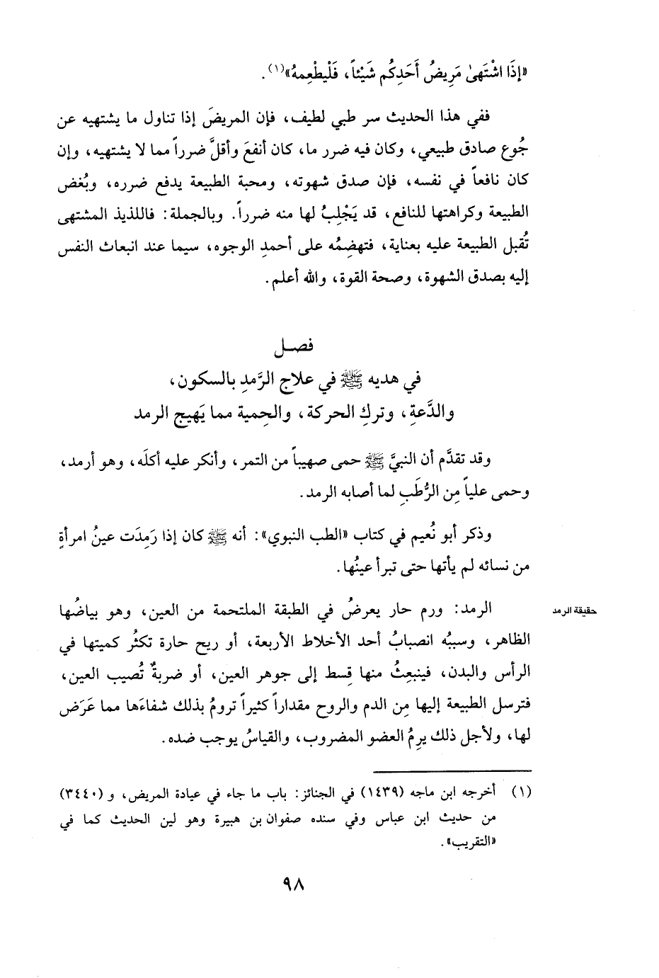 فَصْلٌ فِي هَدْيِهِ صَلَّى اللَّهُ عَلَيْهِ وَسَلَّمَ فِي عِلَاجِ الرَّمَدِ بِالسُّكُونِ، وَالدَّعَةِ وَتَرْكِ الْحَرَكَةِ، وَالْحِمْيَةِ مِمَّا يَهِيجُ الرَّمَدَ