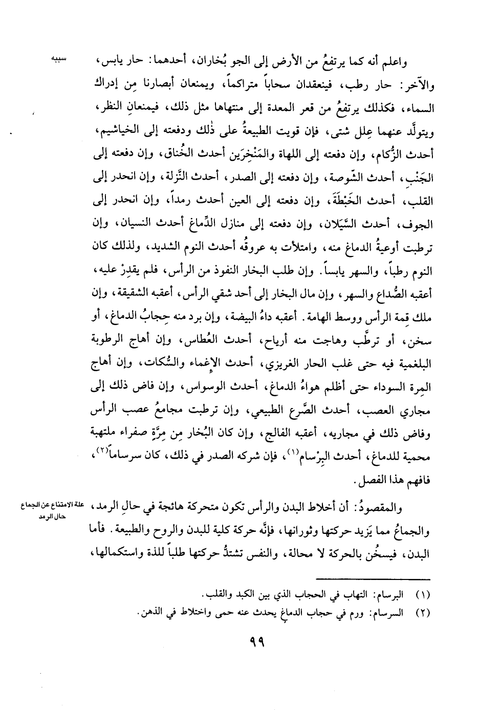 وَاعْلَمْ أَنَّهُ كَمَا يَرْتَفِعُ مِنَ الْأَرْضِ إِلَى الْجَوِّ بُخَارَانِ، أَحَدُهُمَا: حَارٌّ يَابِسٌ، وَالْآخَرُ حَارٌّ رَطْبٌ، فَيَنْعَقِدَانِ سَحَابًا مُتَرَاكِمًا، وَيَمْنَعَانِ أَبْصَارَنَا مِنْ إِدْرَاكِ السَّمَاءِ، فَكَذَلِكَ يَرْتَفِعُ مِنْ قَعْرِ الْمَعِدَةِ إِلَى مُنْتَهَاهَا مِثْلُ ذَلِكَ، فَيَمْنَعَانِ النَّظَرَ، وَيَتَوَلَّدُ عَنْهُمَا عِلَلٌ شَتَّى، فَإِنْ قَوِيَتِ الطَّبِيعَةُ عَلَى ذَلِكَ وَدَفَعَتْهُ إِلَى الْخَيَاشِيمِ، أَحْدَثَ الزُّكَامَ، وَإِنْ دَفَعَتْهُ إِلَى اللَّهَاةِ وَالْمَنْخِرَيْنِ أَحْدَثَ الْخُنَاقَ، وَإِنْ دَفَعَتْهُ إِلَى الْجَنْبِ، أَحْدَثَ الشَّوْصَةَ، وَإِنْ دَفَعَتْهُ إِلَى الصَّدْرِ أَحْدَثَ النَّزْلَةَ، وَإِنِ انْحَدَرَ إِلَى الْقَلْبِ أَحْدَثَ الْخَبْطَةَ، وَإِنْ دَفَعَتْهُ إِلَى الْعَيْنِ أَحْدَثَ رَمَدًا، وَإِنِ انْحَدَرَ إِلَى الْجَوْفِ أَحْدَثَ السَّيَلَانَ، وَإِنْ دَفَعَتْهُ إِلَى مَنَازِلِ الدِّمَاغِ أَحْدَثَ النِّسْيَانَ، وَإِنْ تَرَطَّبَتْ أَوْعِيَةُ الدِّمَاغِ مِنْهُ وَامْتَلَأَتْ بِهِ عُرُوقُهُ أَحْدَثَ النَّوْمَ الشَّدِيدَ، وَلِذَلِكَ كَانَ النَّوْمُ رَطْبًا، وَالسَّهَرُ يَابِسًا. وَإِنْ طَلَبَ الْبُخَارُ النُّفُوذَ مِنَ الرَّأْسِ، فَلَمْ يَقْدِرْ عَلَيْهِ أَعْقَبَهُ الصُّدَاعُ وَالسَّهَرُ، وَإِنْ مَالَ الْبُخَارُ إِلَى أَحَدِ شِقَّيِ الرَّأْسِ، أَعْقَبَهُ الشَّقِيقَةُ، وَإِنْ مَلَكَ قِمَّةَ الرَّأْسِ وَوَسَطَ الْهَامَةِ، أَعْقَبَهُ دَاءُ الْبَيْضَةِ، وَإِنْ بَرُدَ مِنْهُ حِجَابُ الدِّمَاغِ، أَوْ سَخُنَ أَوْ تَرَطَّبَ وَهَاجَتْ مِنْهُ أَرْيَاحٌ، أَحْدَثَ الْعُطَاسَ، وَإِنْ أَهَاجَ الرُّطُوبَةَ الْبَلْغَمِيَّةَ فِيهِ حَتَّى غَلَبَ الْحَارُّ الْغَرِيزِيُّ، أَحْدَثَ الْإِغْمَاءَ وَالسُّكَاتَ، وَإِنْ أَهَاجَ الْمِرَّةَ السَّوْدَاءَ حَتَّى أَظْلَمَ هَوَاءُ الدِّمَاغِ، أَحْدَثَ الْوَسْوَاسَ، وَإِنْ فَاضَ ذَلِكَ إِلَى مَجَارِي الْعَصَبِ أَحْدَثَ الصَّرَعَ الطَّبِيعِيَّ، وَإِنْ تَرَطَّبَتْ مَجَامِعُ عَصَبِ الرَّأْسِ وَفَاضَ ذَلِكَ فِي مَجَارِيهِ أَعْقَبَهُ الْفَالِجُ، وَإِنْ كَانَ الْبُخَارُ مِنْ مِرَّةٍ صَفْرَاءَ مُلْتَهِبَةٍ مَحْمِيَّةٍ لِلدِّمَاغِ، أَحْدَثَ الْبِرْسَامَ، فَإِنْ شَرِكَهُ الصَّدْرُ فِي ذَلِكَ كَانَ سِرْسَامًا، فَافْهَمْ هَذَا الْفَصْلَ.