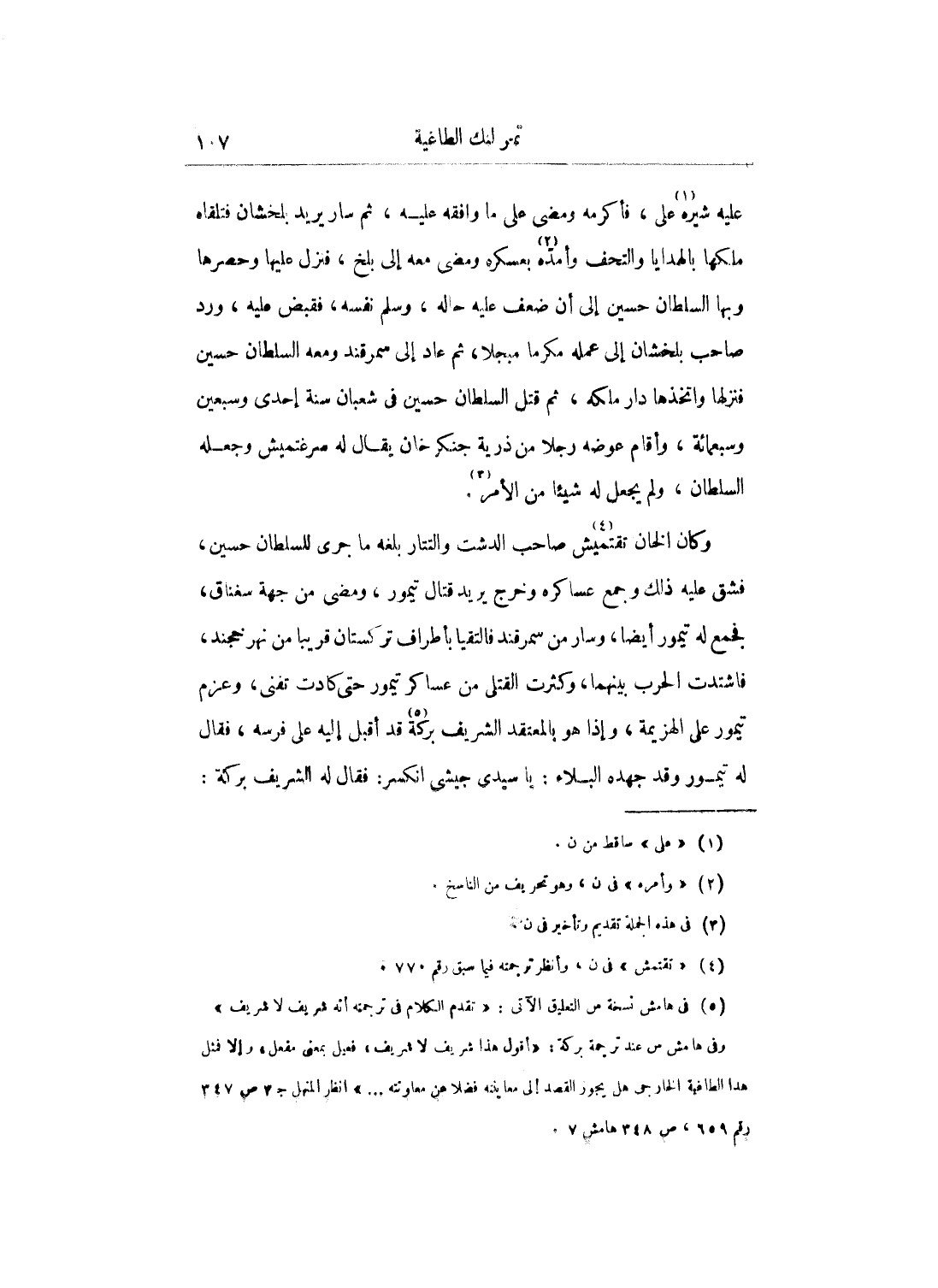 عليه شيره على، فأكرمه ومضى على ما وافقه عليه، ثم سار يريد بلخشان فتلقاه ملكها بالهدايا والتحف وأمده بعسكره ومضى معه إلى بلخ، فنزل عليها وحصرها وبها السلطان حسين إلى أن ضعف عليه حاله، وسلم نفسه، فقبض عليه، ورد صاحب بلخشان إلى عمله مكرما مبجلا، ثم عاد إلى سمرقند ومعه السلطان حسين فنزلها واتخذها دار ملكه، ثم قتل السلطان حسين في شعبان سنة إحدى وسبعين وسبعمائة، وأقام عوضه رجلاً من ذرية جنكر خان يقال له سرغتميش وجعله السلطان، ولم يجعل له شيئاً من لأمر.