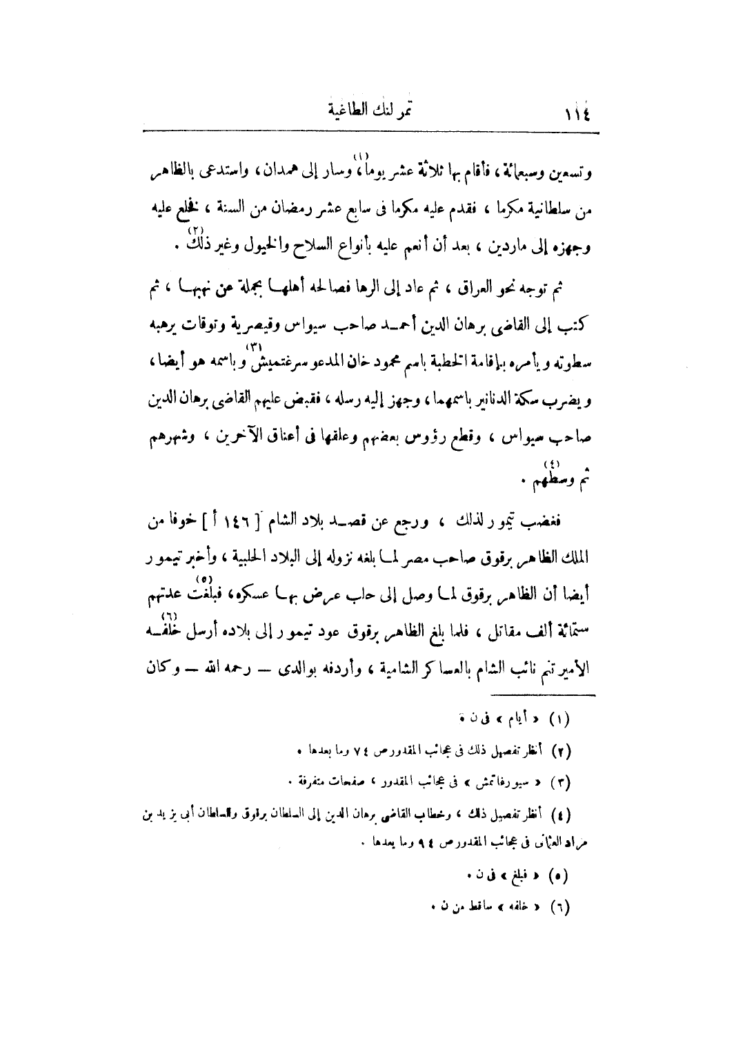 فغضب تيمور لذلك، ورجع عن قصد بلاد الشام خوفا من الملك الظاهر برقوق صاحب مصر لما بلغه نزوله إلى البلاد الحلبية، وأخبر تيمور أيضاً أن الظاهر برقوق لما وصل إلى حلب عرض بها عسكره، فبلغت عدتهم ستمائة ألف مقاتل، فلما بلغ الظاهر برقوق عود تيمور إلى بلاده أرسل خلفه الأمير تنم نائب الشام بالعساكر الشامية، وأردفه بوالدى رحمه الله وكان
