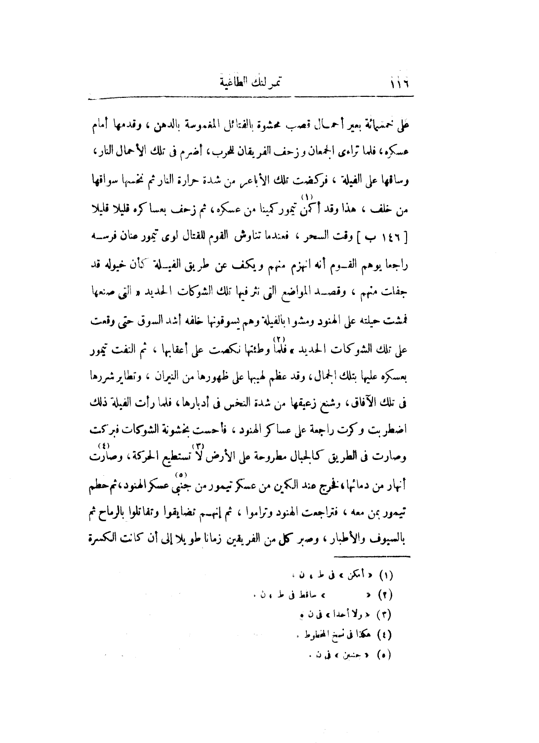 على خمسمائة بعير أحمال قصب محشوة بالفتائل المغموسة بالدهن، وقدمها أمام عسكره، فلما تراءى الجمعان وزحف الفريقان للحرب، أضرم في تلك الأحمال النار، وساقها على الفيلة، فركضت تلك الأباعر من شدة حرارة النار ثم نخسها سواقها من خلف، هذا وقد أكمن تيمور كميناً من عسكره، ثم زحف بعساكره قليلا قليلاً وقت السحر، فعندما تناوش القوم للقتال لوى تيمور عنان فرسه راجعاً يوهم القوم أنه انهزم منهم ويكف عن طريق الفيلة كأن خيوله قد جفلت منهم، وقصد المواضع التي نثر فيها تلك الشوكات الحديد التي صنعها فمشت حيلته على الهنود ومشوا بالفيلة وهم يسوقونها خلفه أشد السوق حتى وقعت على تلك الشوكات الحديد فلما وطئتها نكصت على أعقابها، ثم التفت تيمور بعسكره عليها بتكل الجمال، وقد عظم لهيبها على ظهورها من النيران، وتطاير شررها في تلك الآفاق، وشنع زعيقها من شدة النخس في أدبارها، فلما رأت الفيلة ذلك اضطربت وكرت راجعة على عساكر الهنود، فأحست بخشونة الشوكات فبركت وصارت في الطريق كالجبال مطروحة على الأرض لا تستطيع الحركة، وصارت أنهار من دمائها، فخرج عند الكمين من عسكر تيمور من جنبي عسكر الهنود، ثم حطم تيمور بمن معه، فتراجعت الهنود وتراموا، ثم إنهم تضايقوا وتقاتلوا بالرماح ثم بالسيوف والأطبار، وصبر كل من الفريقين زمانا طويلا إلى أن كانت الكسرة