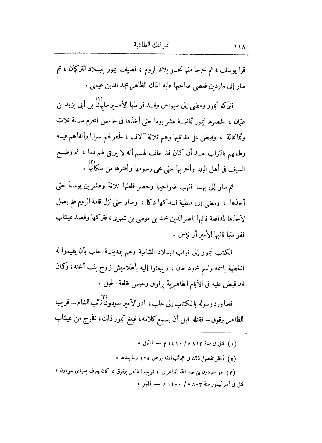 قرا يوسف، ثم خرجا منها نحو بلاد الروم، فصيف تيمور ببلاد التركمان، ثم سار إلى ماردين فعصى صاحبها عليه الملك الظاهر مجد الدين عيسى.