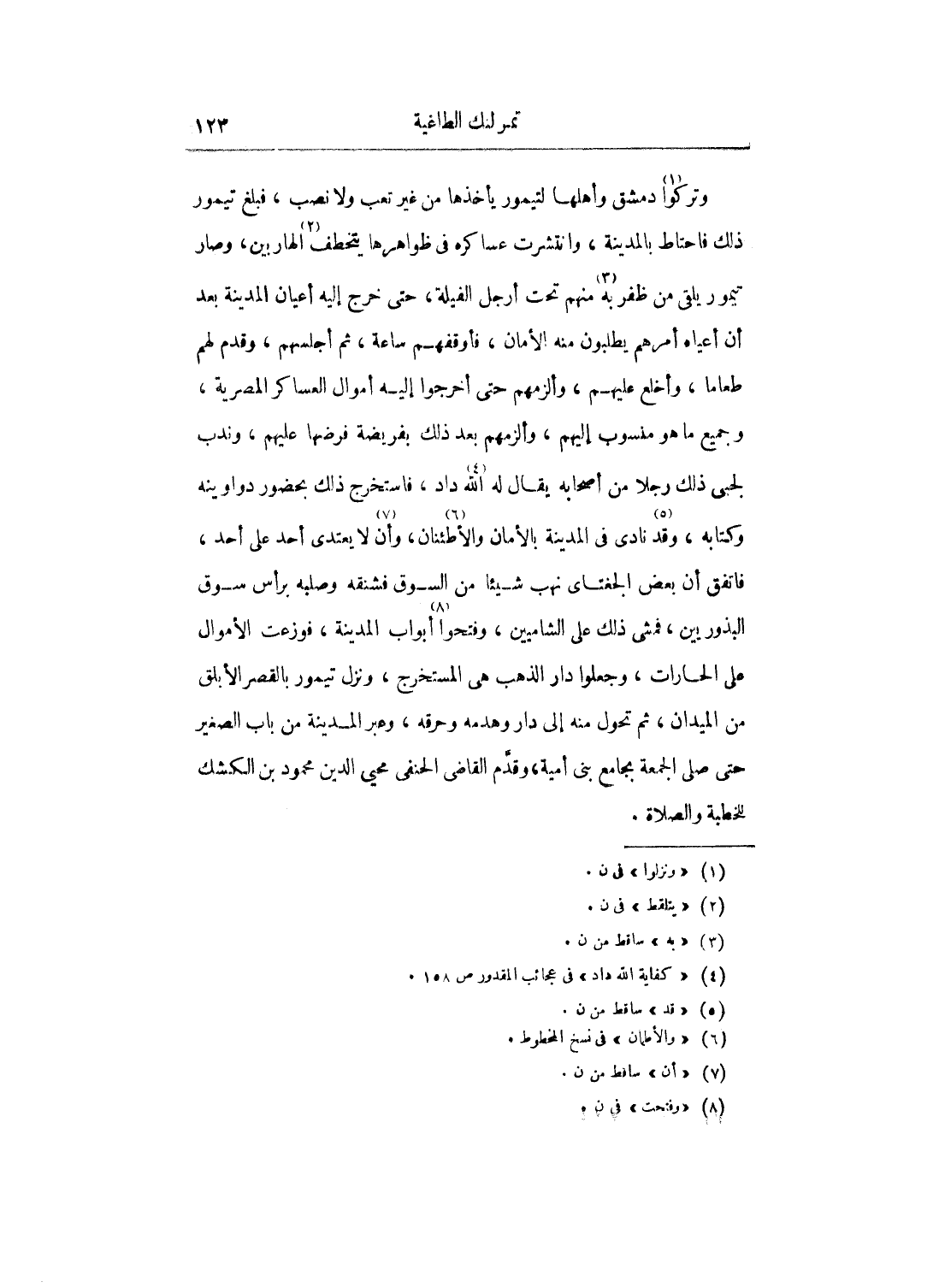 وتركوا دمشق وأهلها لتيمور يأخذها من غير تعب ولا نصب، فبلغ تيمور ذلك فاحتاط بالمدينة، وانتشرت عساكره في ظواهرها يتخطف الهاربين، وصار تيمور ويلقى من ظفر به منهم تحت أرجل الفيلة، حتى خرج إليه أعيان المدينة بعد أن أعياه أمرهم يطلبون منه الأمان، فأوقفهم ساعة، ثم أجلسهم، وقدم لهم طعاماًن وأخلع عليهم، وألزمهم حتى أخرجوا إليه أموال العساكر المصرية، وجميع ما هو منسوب إليهم، وألزمهم بعد ذلك بفريضة فرضها عليهم، وندب لجبي ذلك رجلاً من أصحابه يقال له الله داد، فاستخرج ذلك بحضور دواوينه وكتابه، وقد نادى في المدينة بالأمان والأطئنان، وأن لا يتعدى أحد على أحد، فاتفق أن بعض الجغتاى نهب شيئاً نهب شيئاً من السوق فشنقه وصلبه برأس سوق البذوريين، فمشى ذلك على الشاميي، وفتحوا أبواب المدينة، فوزعت الأموال على الحارات، وجعلوا دار الذهب هي المستخرج، ونزل تيمور بالقصر الأبلق من الميدان، ثم تحول منه إلى دار وهدمه وحرقه، وعبر المدينة من باب الصغير حتى صلى الجمعة بجامع بني أمية، وقدم القاضي الحنفي محي الدين محمود بن الكشك للخطبة والصلاة.