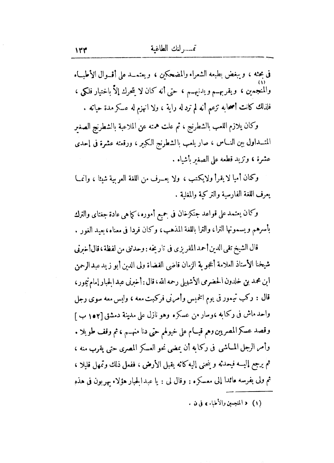 قال الشيخ تقي الدين أحمد المقريزى في تاريخه: وحدثني من لفظة، قال أخبرني شيخنا الأستاذ العلامة أعجوبة الزمان قاضي القضاة ولى الدين أبو زيد عبد الرحمن ابن محمد بن خلدون الحضرمي الأشبيلى رحمه الله، قال: أخبرني عبد الجبار إمام تيمور، قال: ركب تيمور في يوم الخميس وأمرني فركبت معه، وليس معه سوى رجل واحد ماش في ركابه، وسار من عسكره وهو نازل على مدينة دمشق وقصد عسكر المصريين وهم قيام على خيولهم حتى دنا منهم، ثم وقف طويلاً.