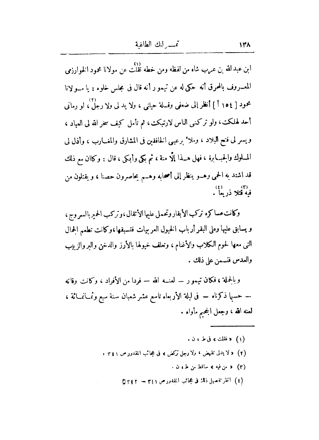 ابن عبد الله بن عرب شاه من لفظه ومن خطه نقلت عن مولانا محمود الخوارزمي المعروف بالمحرق أنه حكى له عن تيمور أنه قال في مجلس خلوه: يا مولانا محمود انظر إلى ضعفي وقلة حيلتي، ولا يدلى ولا رجل، لو رماني أحد لهلكت، ولو تركني الناس لا رتبكت، ثم تأمل كيف سخر الله لي العباد، ويسر لي فتح البلاد، وملأ برعبس الخافقين في المشارق والمغارب، وأذل لي الملوك والجبابرة، فهل هذا إلا منة، ثم بكى وأبكى، قال: وكان مع ذلك قد اشتد به الحمى وهو ينظر إلى أصحابه وهم يحاصرون حصنا، ويقتلون فيه قتلاً ذريعاً.