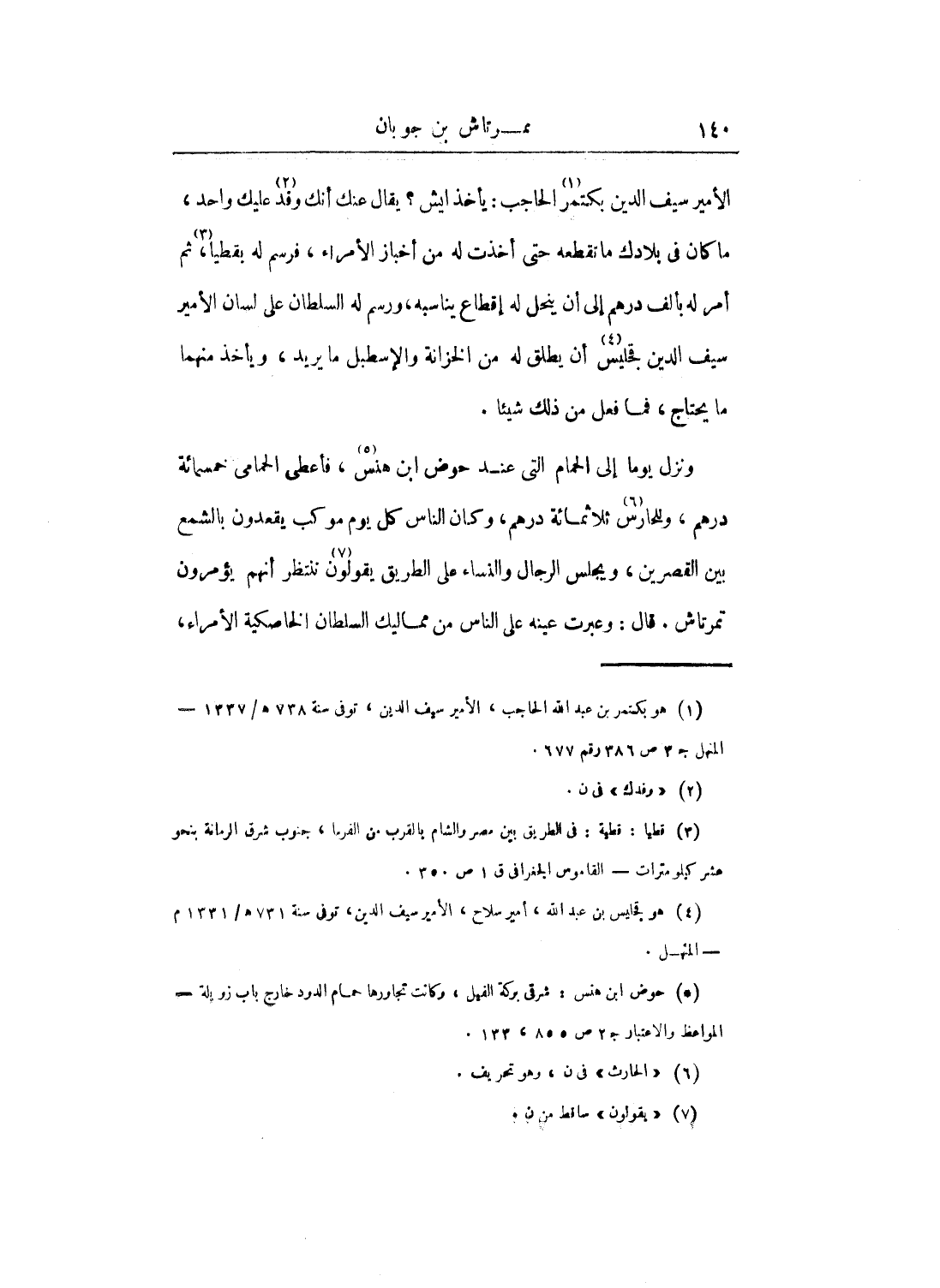 ونزل يوماً إلى الحمام التي عند حوض ابن هنس، فأعطى الحمامي خمسمائة درهم، وللحارس ثلاثمائة درهم، وكان الناس كل يوم موكب يقعدون بالشمع بين القصرين، ويجلس الرجال والنساء على الطريق يقولون ننتظر أنهم يؤمرون تمرتاش. قال: وعبرت عينه على الناس من مماليك السلطان الخاصكية الأمراء،