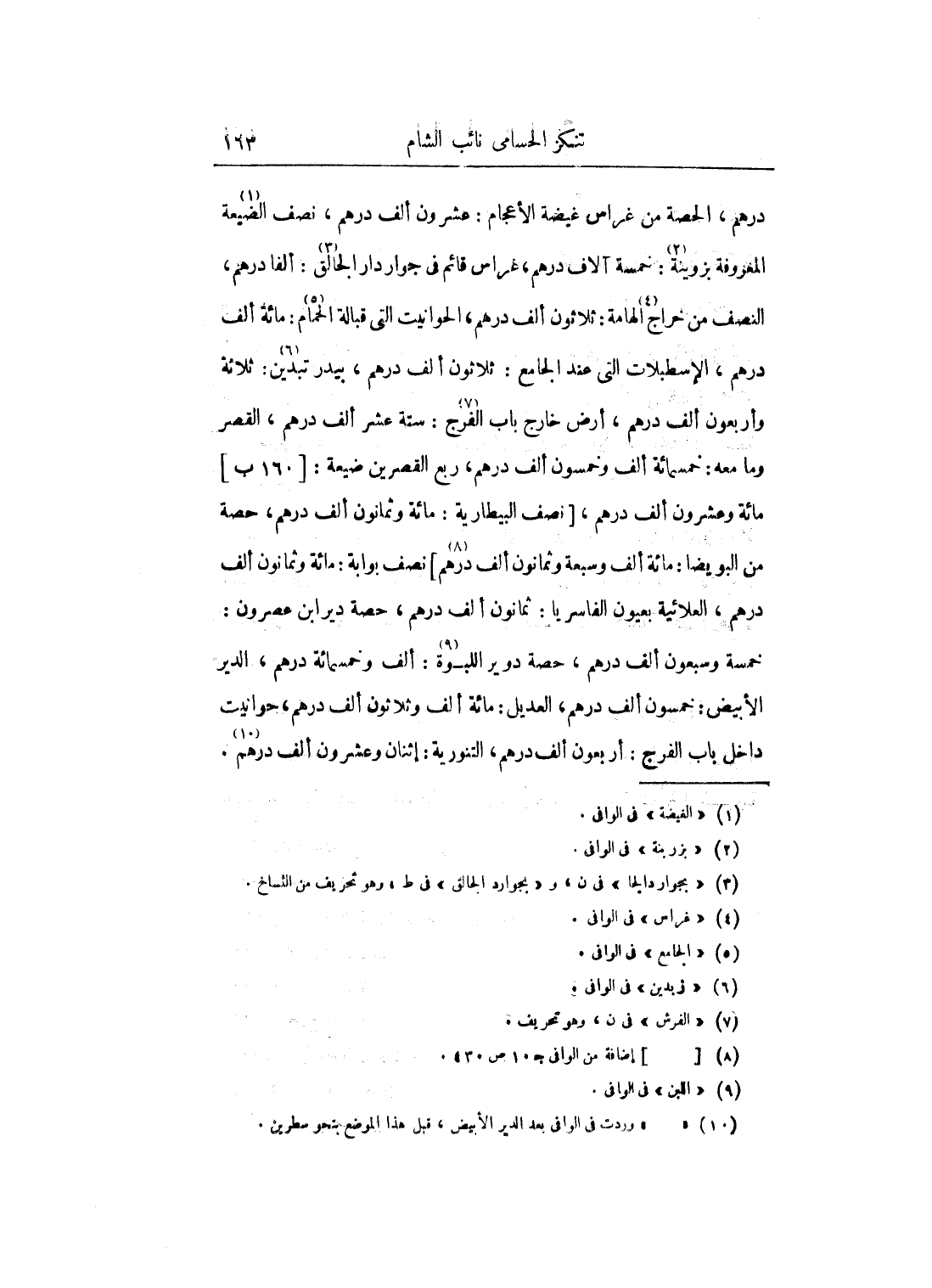 درهم، الحصة من غراس غيضة الأعجام: عشرون ألف درهم: نصف الضيعة المعروفة بزوينة: خمسة آلاف درهم، غراس قائم في جوار دار الجالق: ألفا درهم، النصف من خراج الهامة: ثلاثون ألف درهم، الحوانيت التي قبالة الحمام: مائة ألف درهم، الإسطبلات التي عند الجامع: ثلاثون ألف درهم، بيدر تبدين: ثلاثة وأربعون ألف درهمن أرض خارج باب الفرج: ستة عشر ألف درهم، القصر وما معه: خمسمائة ألف وخمسون ألف درهم، ربع القصرين ضيعة: مائة وعشرون ألف درهم، نصف البيطارية: مائة وثمانون ألف درهم، حصة من البويضا: مائة ألف وسبعة وثمانون ألف درهم نصف بوابة: مائة وثمانون ألف درهم، العلائية بعيون الفاسريا: ثمانون ألف درهم، حصة ديرا بن عصرون: خمسة وسبعون ألف درهم، العديل: مائة ألف وثلاثون ألف درهم، حوانيت داخل باب الفرج: أربعون ألف درهم، التنورية: إثنان وعشرون ألف درهم.