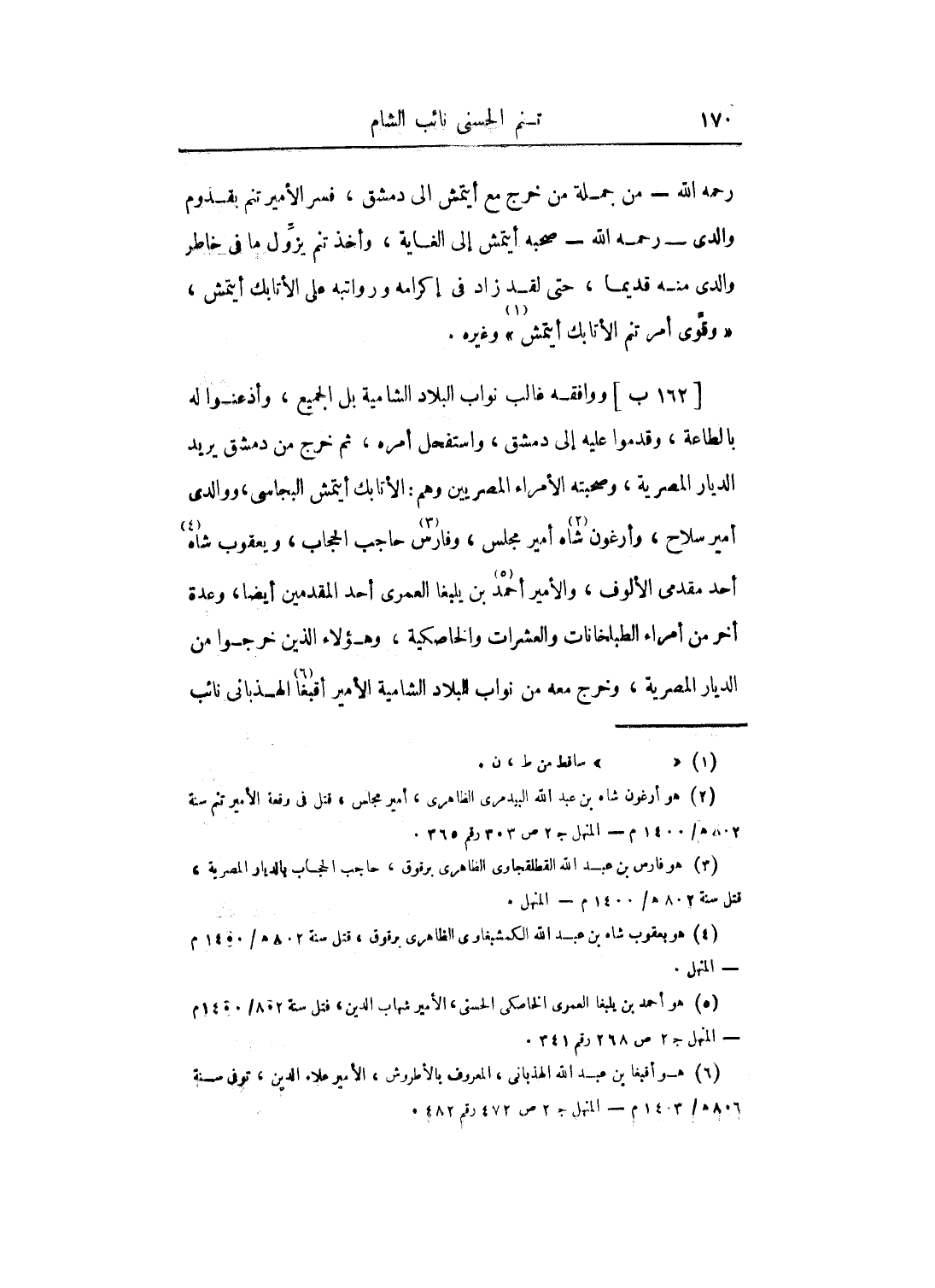 ووافقه غالب نواب البلاد الشامية بل الجميع، وأذعنوا له بالطاعة، وقدموا عليه إلى دمشق، واستفحل أمره، ثم خرج من دمشق يريد الديار المصرية، وصحبته الأمراء المصريين وهم: الأتابك أيتمش البجاسى، ووالدي أمير سلاح، وأرغون شاه أمير مجلس، وفارس حاجب الحجاب، ويعقوب شاه أحد مقدمي الألوف، والأمير أحمد بن يلبغا العمري أحد المقدمين أيضاً، وعدة أخر من أمراء الطبلخانات والعشرات والخاصكية، وهؤلاء الذين خرجوا من الديار المصرية، وخرج معه من نواب البلاد الشامية الأمير أقبغا الهذباني نائب