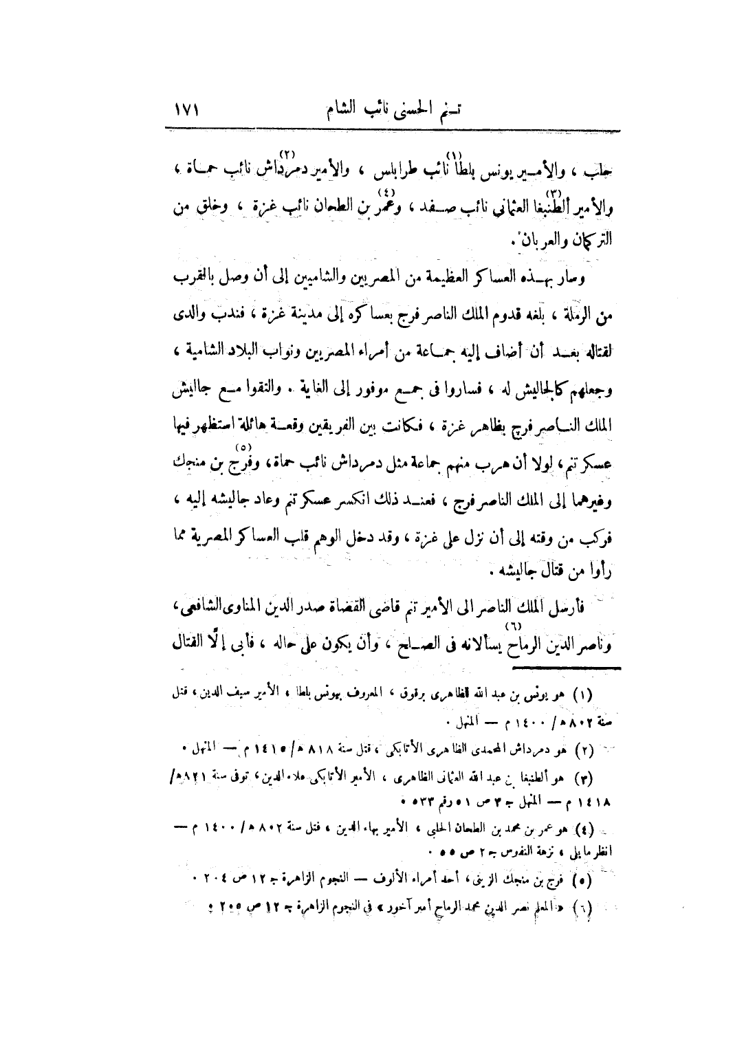 حلب، والأمير يونس بلطا نائب طرابلس، والأمير دمرداش نائب حماة، والأمير ألطنبغا العثماني نائب صفد، وعمر بن الطحان نائب غزة، وخلق من التركمان والعربان.