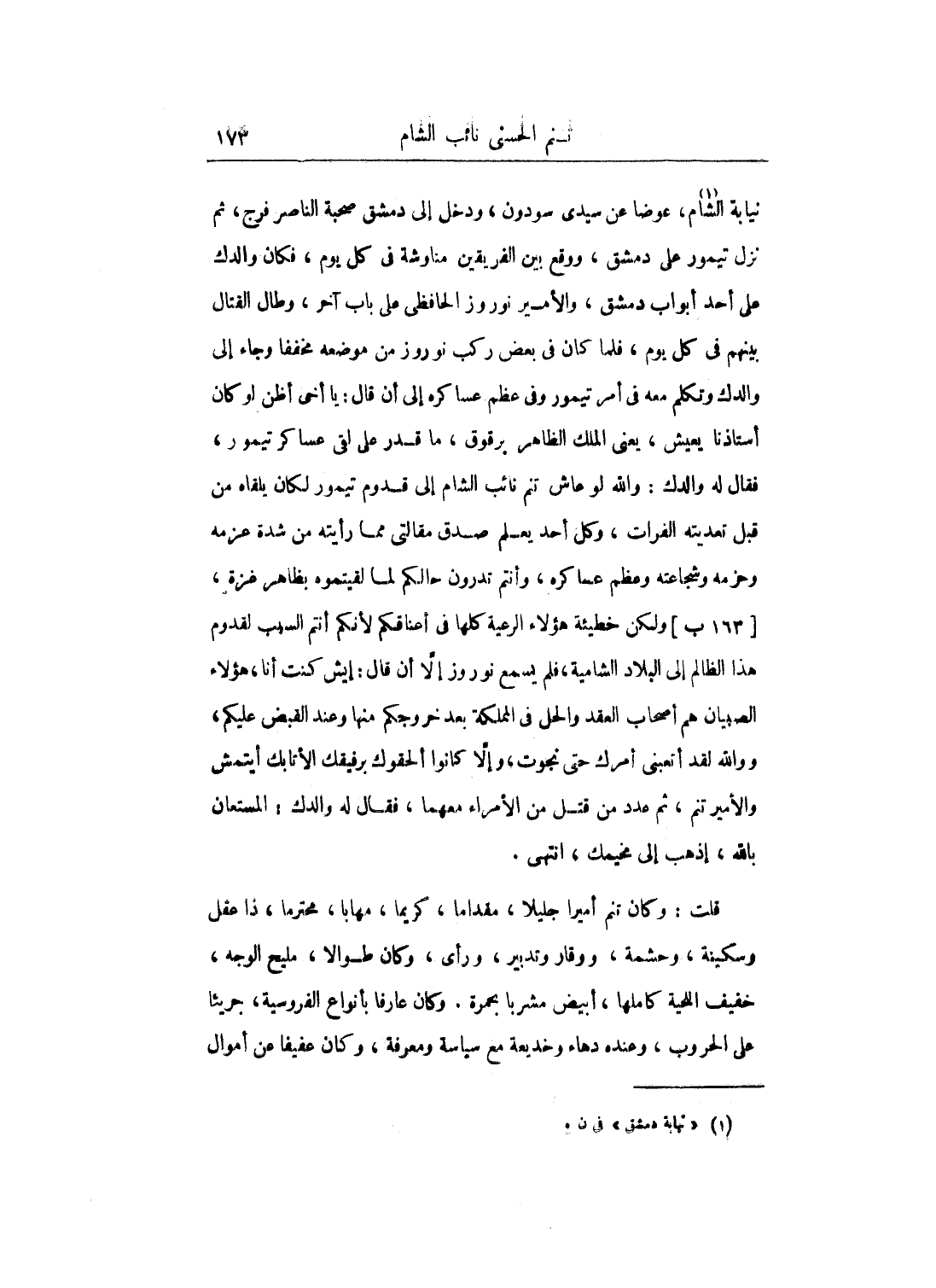 نيابة الشام، عوضاً عن سيدي سودون، ودخل إلى دمشق صحبة الناصر فرج، ثم نزل تيمور على دمشق، ووقع بين الفريقين مناوشة في كل يوم، فكان والدك على أحد أبواب دمشق، والأمير نوروز الحافظي على باب آخر، وطال القتال بينهم في كل يوم، فلما كان في بعض ركب نوروز من موضعه مخففاً وجاء إلى والدك وتكلم معه في أمر تيمور وفي عظم عساكره إلى أن قال: يا أخي أظن لو كان أستاذناً يعيش، يعنى الملك الظاهر برقوق، ما قدر على لقي عساكر تيمور، فقال له والدك: والله لو عاش تنم نائب الشام إلى قدوم تيمور لكان يلقاه من قبل تعديته الفرات، وكل أحد يعلم صدق مقالتي مما رأيته من شدة عزمه وحزمه وشجاعته وعظم عساكره، وأنتم تدرون حالكم لما لقيتموه بظاهر غزة، ولكن خطيئة هؤلاء الرعية كلها في أعناقكم لأنكم أنتم السبب لقدوم هذا الظالم إلى البلاد الشامية، فلم يسمع نوروز إلا أن قال: إيش كنت أنا، هؤلاء الصبيان هم أصحاب العقد والحل في المملكة بعد خروجكم منها وعند القبض عليكم، ووالله لقد أتعبني أمرك حتى نجوت، وإلا كانوا ألحقوك برفيقك الأتابك أيتمش والأمير تنم، ثم عدد من قتل من الأمراء معهما، فقال له والدك: المستعان بالله، إذهب إلى مخيمك، انتهى.