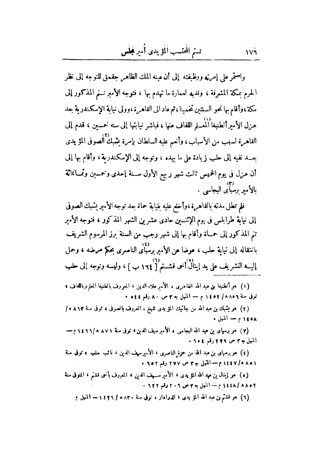 واستمر على إمرته ووظيفته إلى أن عينه الملك الظاهر جقمق للتوجه إلى نظر الحرم بمكة المشرفة، ونديه لعمارة ما تهدم بها، فتوجه الأمير تنم المذكور إلى مكة، وأقام بها نحو السنتين تخمينا، ثم عاد إلى القاهرة، وولى نيابة الإسكندرية بعد عزل الأمير ألطنبغا المعلم اللفاف عنها، فباشر نيابتها إلى سنة خمسين، قدم إلى القاهرة لسبب من الأسباب، وأنعم عليه السلطان بإمرة يشبك الصوفي المؤيدي بعد نفيه إلى حلب زيادة على ما بيده، وتوجه إلى الإسكندرية، وأقام بها إلى أن عزل في يوم الخميس ثالث شهر ربيع الأول سنة إحدى وخمسين وثمانمائة بالأمير برسباى البجاسى.