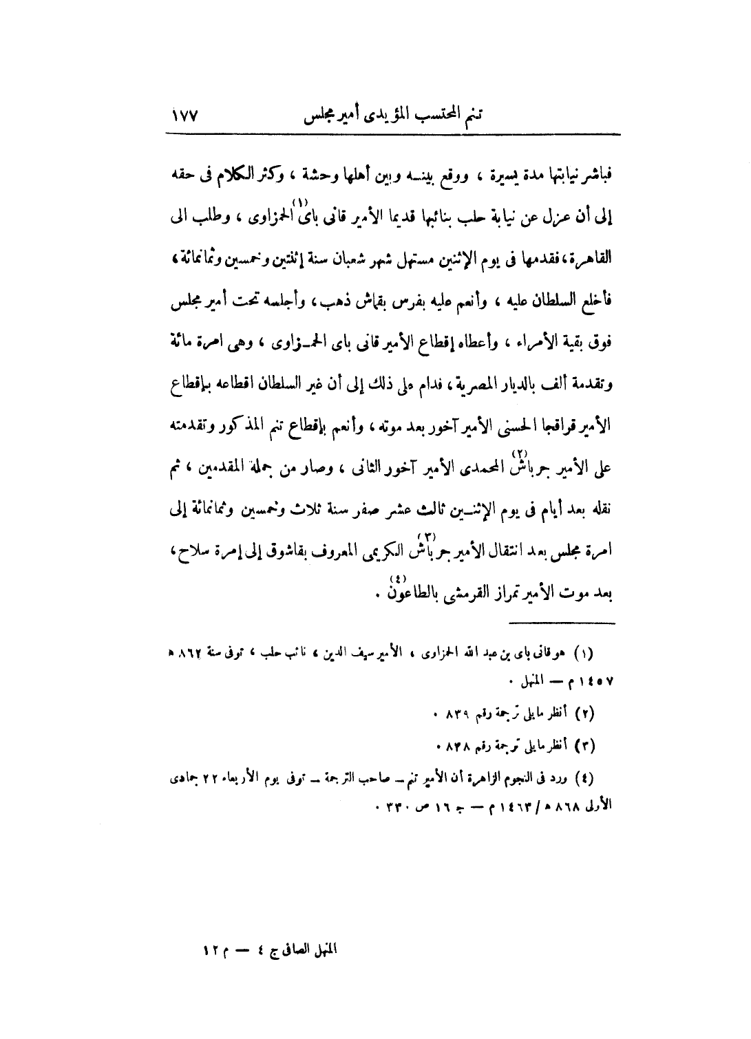 فباشر نيابتها مدة يسيرة، ووقع بينه وبين أهلها وحشة، وكثر الكلام في حقه إلى أن عزل عن نيابة حلب بنائبها قديماً المير قاني باى الحمزاوي، وطلب إلى القاهرة، فقدمها في يوم الإثنين مستهل شهر شعبان سنة إثنتين وخمسين وثمانمائة، فأخلع السلطان عليه، وأنعم عليه بفرس بقماش ذهب، وأجلسه تحت أمير مجلس فوق بقية الأمراء، وأعطاه إقطاع الأمير قاني باى الحمزاوي، وهي إمرة مائة وتقدمة ألف بالديار المصرية، فدام على ذلك إلى أن غير السلطان اقطاعه بإقطاع الأمير قراقجا الحسنى الأمير آخور بعد موته، وأنعم بإقطاع تنم المذكور وتقدمته على الأمير جرباش المحمدي الأمير آخور الثاني، وصار من جملة المقدمين، ثم نقله بعد أيام في يوم الإثنين ثالث عشر صفر سنة ثلاث وخمسين وثمانمائة إلى إمرة مجلس بعد انتقال الأمير جرباش الكريمي المعروف بقاشوق إلى إمرة سلاح، بعد موت الأمير تمراز القرمشي بالطاعون.