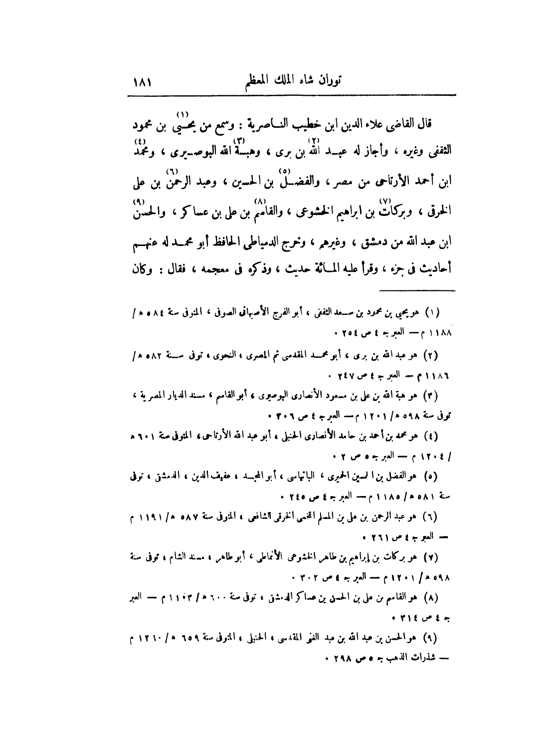 قال القاضي علاء الدين ابن خطيب الناصرية: وسمع من يحيى بن محمود الثقفي وغيره، وأجاز له عبد الله بن برى، وهبة الله البوصيري، ومحمد ابن أحمد الأرتاحى من مصر، والفضل بن الحسين، وعبد الرحمن بن علي الخرقي، وبركات بن إبراهيم الخشوعي، والقاسم بن علي بن عساكر، والحسن ابن عبد الله من دمشق، وغيرهم، وخرج الدمياطي الحافظ أبو محمد له عنهم أحاديث في جزء، وقرأ عليه المائة حديث، وذكره في معجمه، فقال: وكان