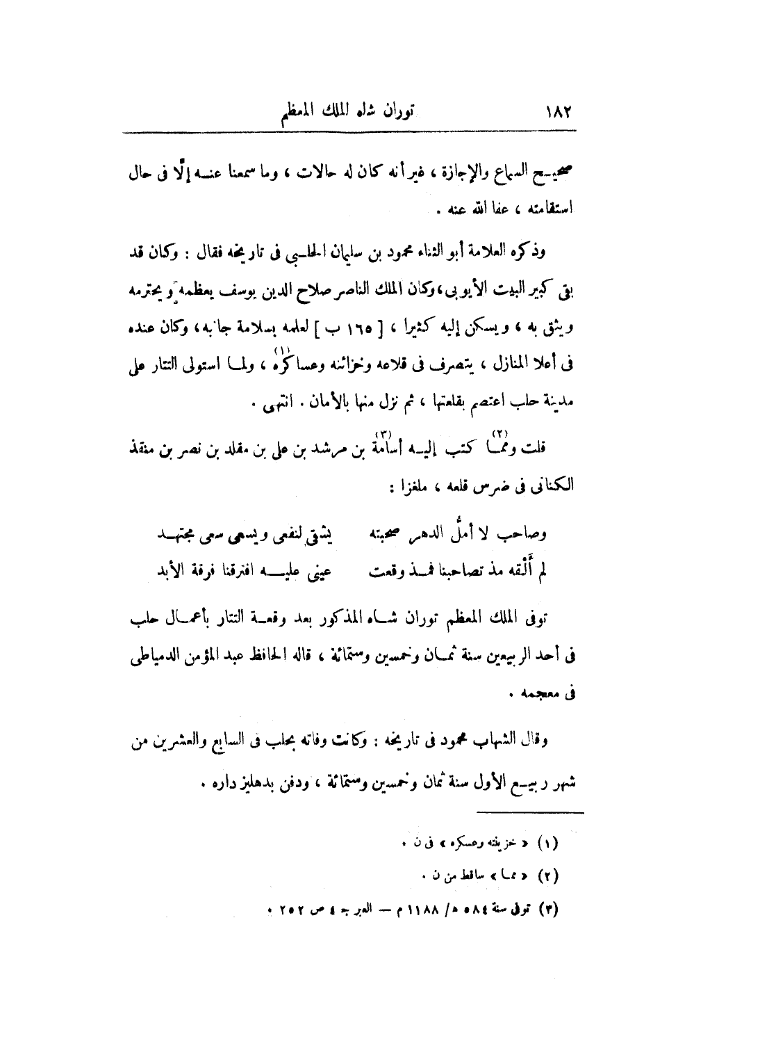 وذكره العلامة أبو الثناء محمود بن سليمان الحلبي في تاريخه فقال: وكان قد بقي كبير البيت الأيوبي، وكان الملك الناصر صلاح الدين يوسف يعظمه ويحترمه ويثق به، ويسكن إليه كثيراً، لعلمه بسلامة جانبه، وكان عنده في أعلا المنازل، يتصرف في قلاعه وخزائنه وعساكره، ولما استولى التتار على مدينة حلب اعتصم بقلعتها، ثم نزل منها بالأمان. انتهى.