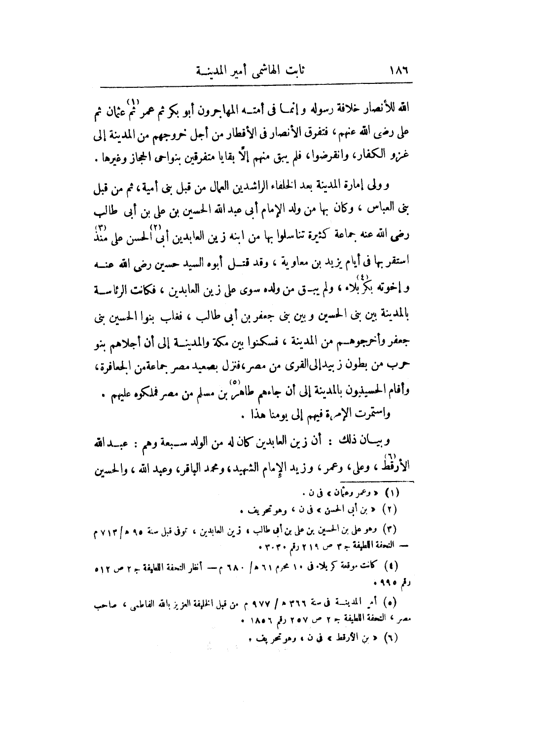 وولى إمارة المدينة بعد الخلفاء الراشيدين العمال من قبل بني أمية، ثم من قبل بني العباس، وكان بها من ولد الإمام أبي عبد الله الحسين بن علي بن أبي طالب رضي الله عنه جماعة كثيرة تناسلوا بها من ابنه زين العابدين أبي الحسن على منذ استقر بها في أيام يزيد بن معاوية، وقد قتل أبوه السيد حسين رضي الله عنه وإخوته بكلا بلاء، ولم يبق من ولده سوى علي زين العابدين، فكانت الرئاسة بالمدينة بين بني الحسين وبين بني جعفر بن أبي طالب، فغلب بنوا الحسين بني جعفر وأخرجوهم من المدينة، فسكنوا بين مكة والمدينة إلى أن أجلاهم بنو حرب من بطون زبيد إلى القرى من مصر، فنزل بصعيد مصر جماعة من الجعافرة، وأقام الحسينيون بالمدينة إلى أن جاءهم طاهر بن مسلم من مصر فملكوه عليهم.