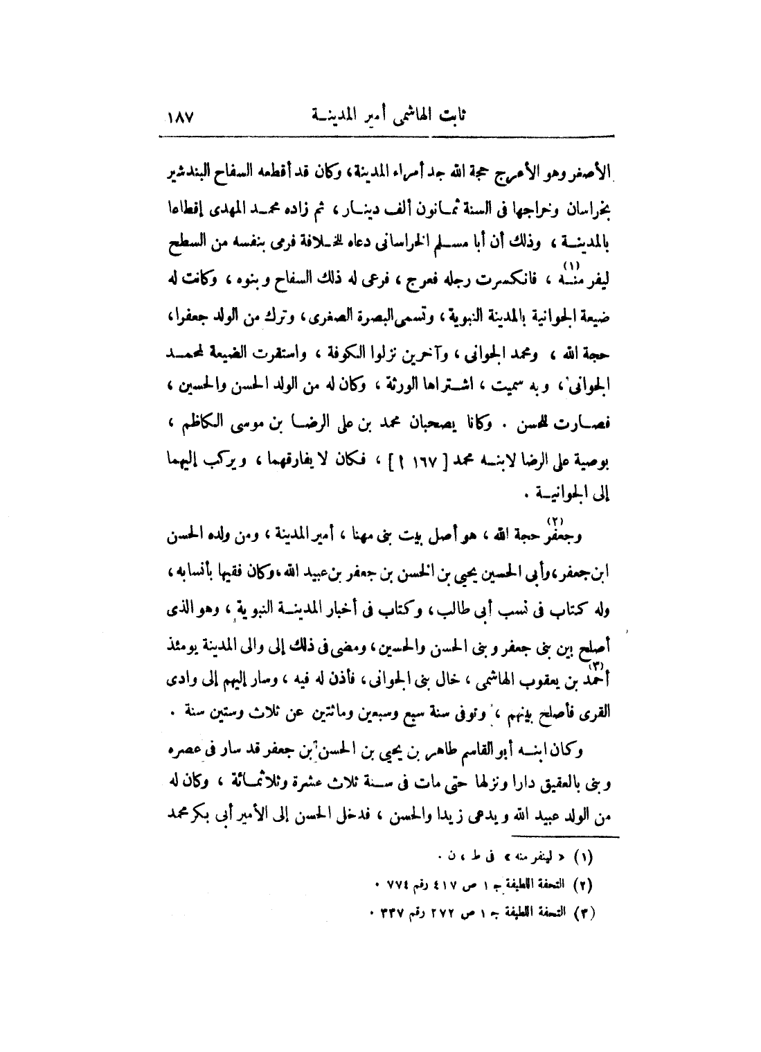 وجعفر حجة الله، هو أصل بيت بني مهنا، أمير المدينة، ومن ولده الحسن ابن جعفر، وأبي الحسين يحيى بن الحسن بن جعفر بن عبيد الله، وكن فقيها بأنسابه، وله كتاب في نسب أبي طالب، وكتاب في أخبار المدينة النبوية، وهو الذي أصلح بين بني جعفر وبين الحسن والحسين، ومضى في ذلك إلى وإلى المدينة يومئذ أحمد بن يعقوب الهاشمي، خال بني الجواني، فأذن له فيه، وسار إليهم إلى وادي القرى فأصلح بينهم، وتوفي سنة سبع وسبعين ومائتين عن ثلاث وستين سنة.