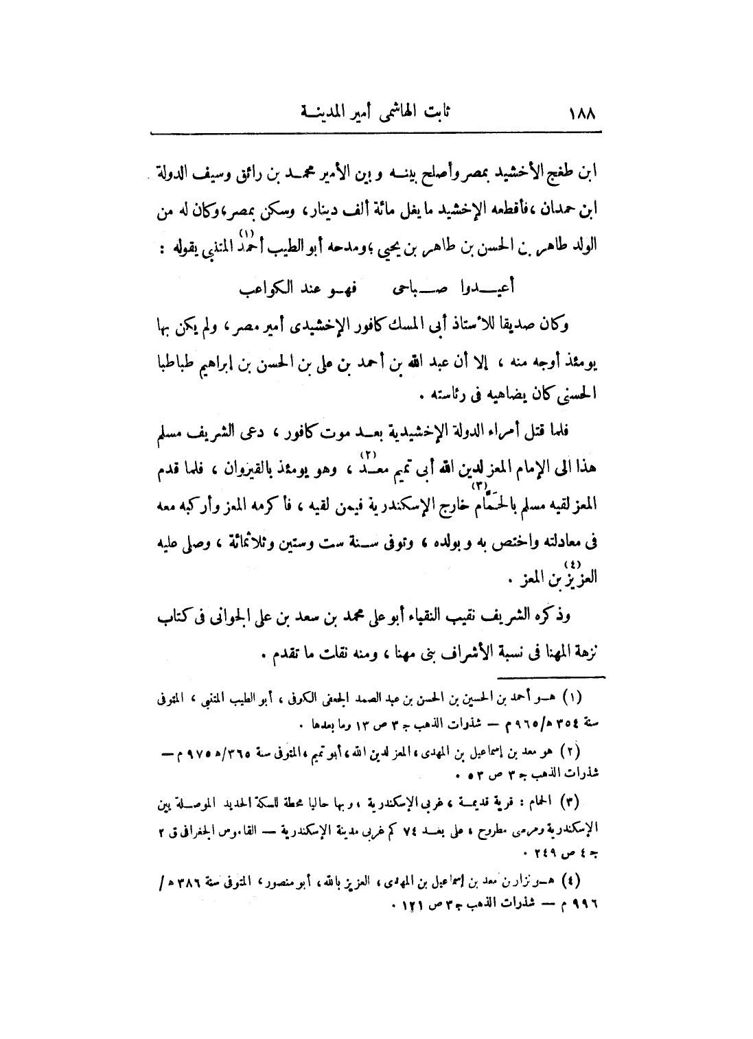 وذكره الشيف نقيب النقباء أبو علي محمد بن سعد بن علي الجواني في كتاب نزهة المهنا في نسبة الأشراف بني مهنا، ومنه نقلت ما تقدم.