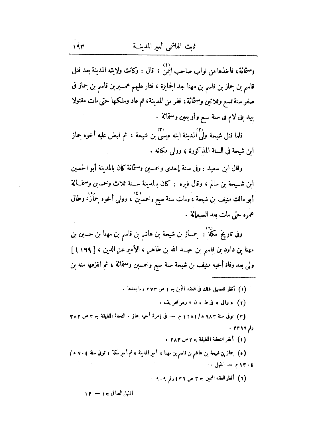 وستمائة، فأخذها من نواب صاحب اليمن، قال: وكانت ولايته المدينة بعد قتل قاسم بن جماز بن قاسم بن مهنا جد الجمايزة، فثار عليهم عمير بن قاسم بن جماز في صفر سنة تسع وثلاثين وستمائة، ففر من المدينة، ثم عاد وملكها حتى مات مقتولاً بيد بين لام في سنة سبع وأربعين وستمائة.
