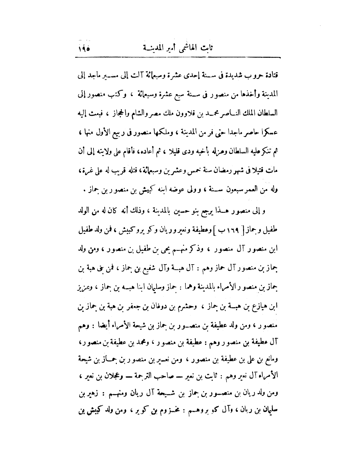 وإلى منصور هذا يرجع بنو حسين بالمدينة، وذلك أنه كان له من الولد طفيل وجماز وعطيفة ونعير وريان وكوير وكبيش، فمن ولد طفيل ابن منصور آل منصور، وذكر منهم يحيى بن طفيل بن منصور، ومن ولد جماز بن منصور آل حماز وهم: آل هبة وآل شفيع بن جماز، فمن بني هبة بن جماز بن منصور الأمراء بالمدينة وهما: جماز وسليمان ابنا هبه بن جماز، وعزيز ابن هيازع بن هبة بن جماز، وحشرم بن دوغان بن جعفر بن هبة بن جماز بن منصور، ومن ولد عطيفة بن منصور بن جماز بن شيحة الأمراء أيضاً: وهم ومانع بن علي بن عطيفة بن منصور، ومن نعير بن منصور بن جماز بن شيحة الأمراء آل نعيروهم: ثابت بن نعير صاحب الترجمة وعجلان بن نعير، ومن ولد ريان بن منصور بن جماز بن شيحة آل ريان ومنهم: زهير بن سليمان بن ريان، وآل كويروهم: مخزوم بن كوير، ومن ولد كبيش بن
