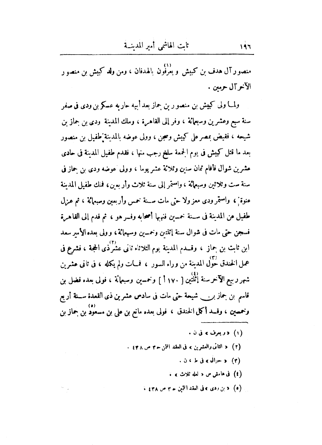 ولما ولى كبيش بن منصور بن جماز بعد أبيه حكاربه عسكر بن ودي في صفر سنة سبع وعشرين وسبعمائة، وفر إلى القاهرة، وملك المدينة وجى بن جماز بن شيحه، فقيض بمصر على كبيش وسجن، وولى عوضه بالمدينة طفيل بن منصور بعد ما قتل كبيش في يوم الجمعة سلخ رجب منها، فقدم طفيل المدينة في حادي عشرين شوال فأقام ثمان وسنتين وثلاثة عشر يوماً، وولى عوضه ودي بن جماز في سنة ست وثلاثين وسبعمائة، واستمر إلى سنة ثلاث وأربعينن فملك طفيل المدينة عنوة، واستمر ودي معز ولا حتى مات سنة خمس وأربعين وسبعمائة، ثم عزل طفيل عن المدينة في سنة خمسين فنهبها أصحابه وفر هو، ثم قدم إلى القاهرة فسجن حتى مات في شوال سنة اثنتين وخمسين وسبعمائة، وولى بعده الأمير سعد ابن ثابت بن جماز، وقدم المدينة يوم الثلاثاء ثاني عشر ذي الحجة، فشرع في عمل الخندق حول المدينة من وراء السور، فمات ولم يكمله، في ثاني عشرين شهر ربيع الآخر سنة إثنتين وخمسين وسبعمائة، فولى بعده فضل بن قاسم بن جماز بن شيحة حتى مات في سادس عشر بن ذي القعدة سنة أربع وخمسين، وقد أكل الخندق، فولى بعده مانع بن علي بن مسعود بن جماز بن