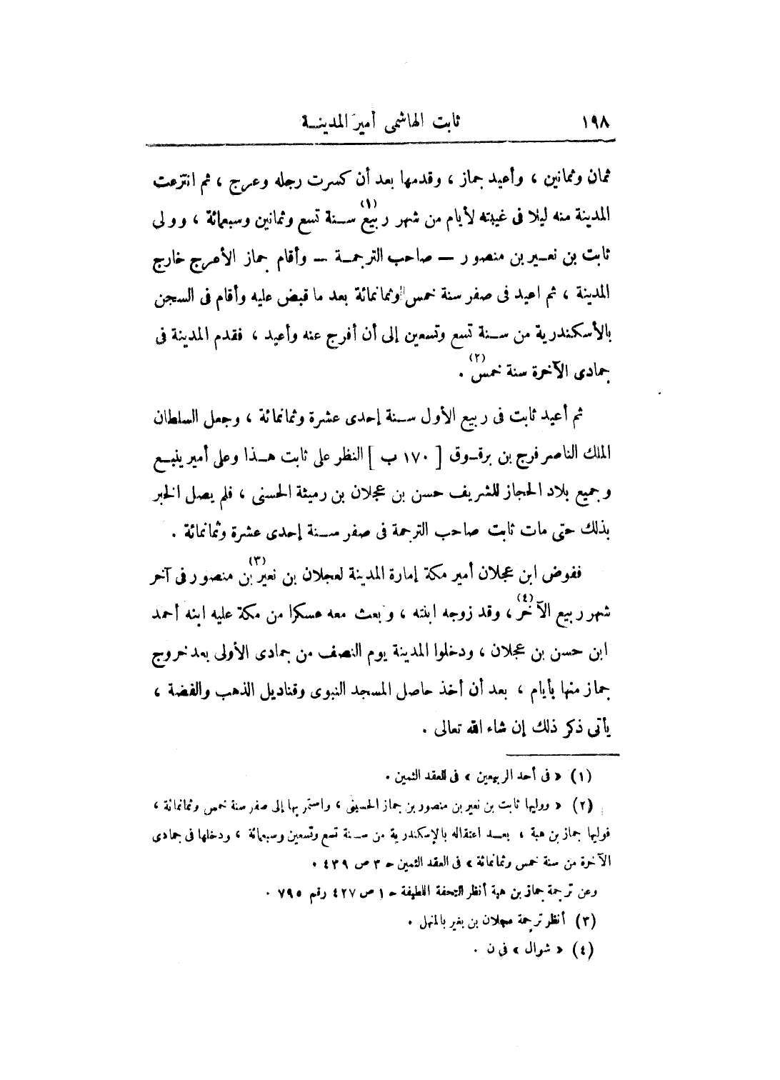 ثمان وثمانين، وأعيد جماز، وقدمها بعد أن كسرت رجله وعرج، ثم انتزعت المدينة منه ليلاً في غيبته لأيام من شهر ربيع سنة تسع وثمانين وسبعمائة، وولى ثابت بن نعير بن منصور صاحب الترجمة وأقام جماز الأعرج خارج المدينة، ثم أعيد في صفر سنة خمس وثمانمائة بعد ما قبض عليه وأقام في السجن بالإسكندرية من سنة تسع وتسعين إلى أن أفرج عنه وأعيد، فقدم المدينة في جمادى الآخرة سنة خمس.