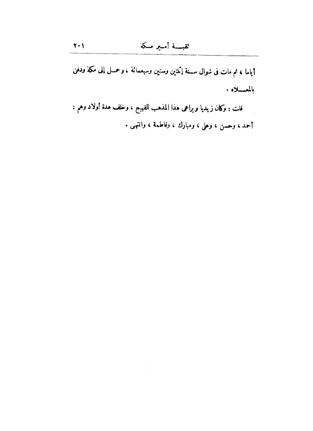 قلت: وكان زيدياً ويراعى هذا المذهب القبيح، وخلف عدة أولاد وهم: أحمد، وحسن، وعلي، ومبارك، وفاطمة، وانتهى.