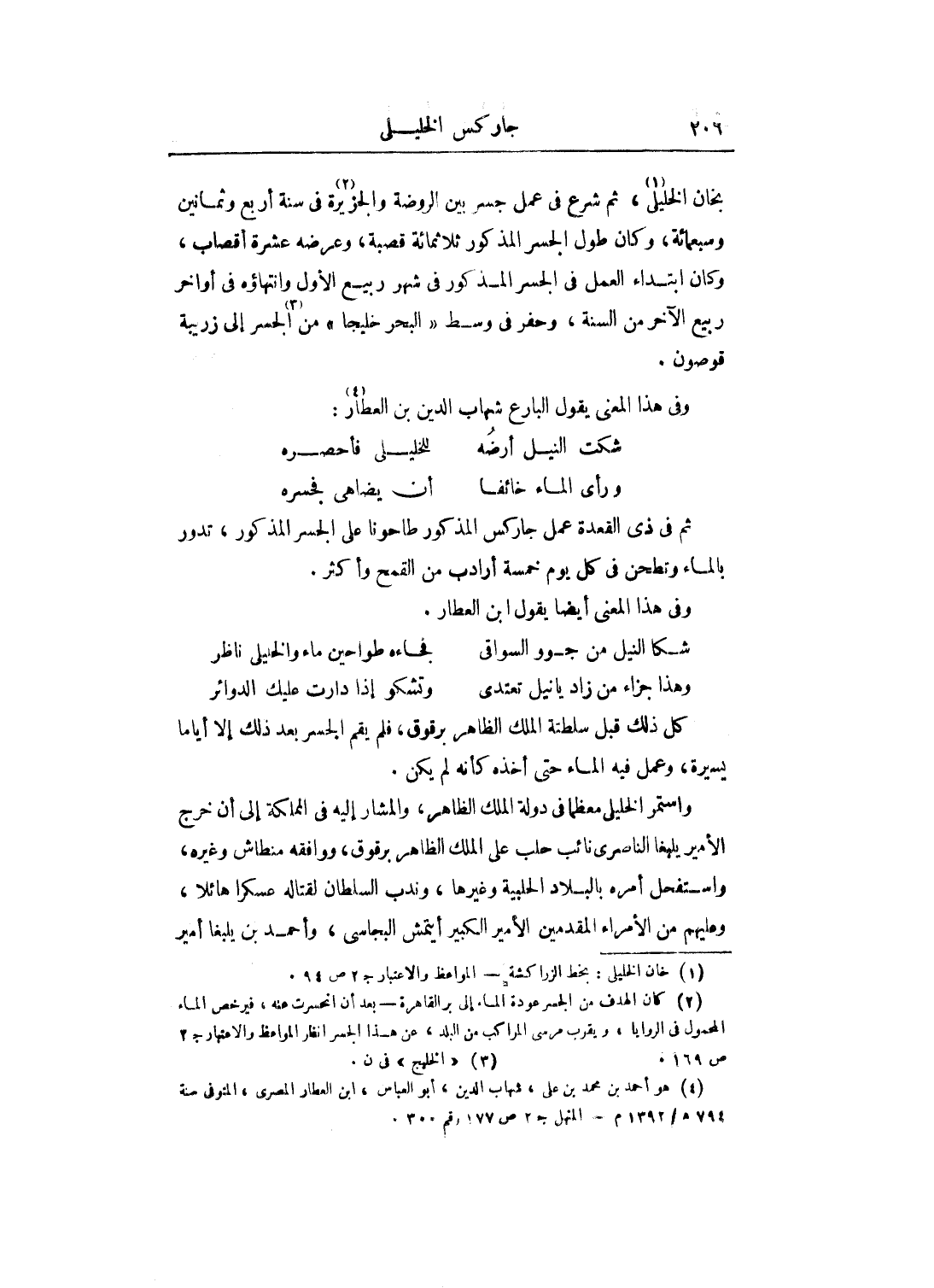 بخان الخليل، ثم شرع في عمل جسر بين الروضة والجزيرة في سنة أربع وثمانين وسبعمائة، وكان طول الجسر المذكور ثلاثمائة قصبة، وعرضه عشرة أقصاب، وكان ابتداء العمل في الجسر المذكور فس شهر ربيع الأول واتهاؤه في أواخر ربيع الآخر من السنة، وحفر في وسط البحر خليجا من الجسر إلى مزريبة قوصون.