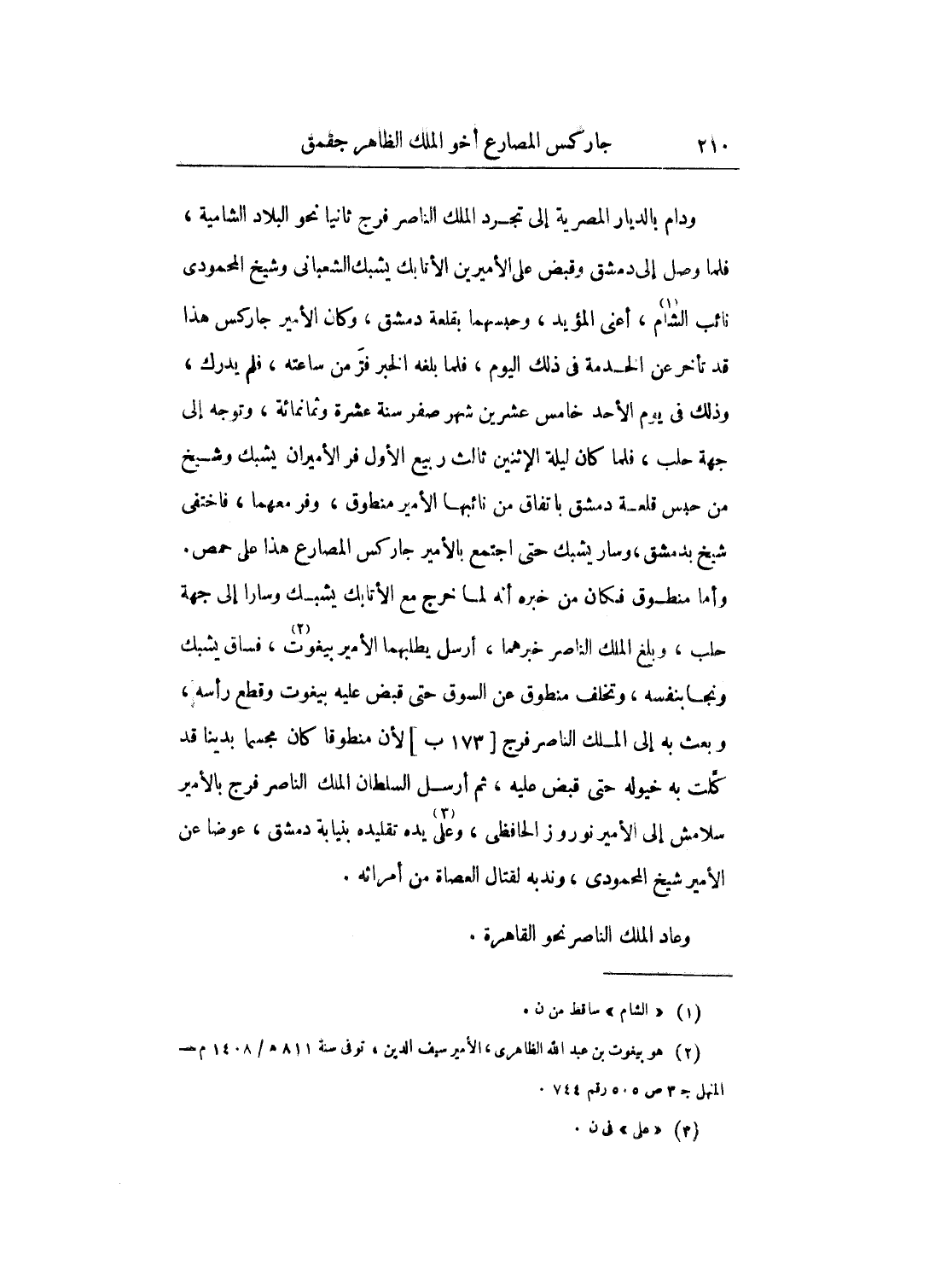 ودام بالديار المصرية إلى تجرد الملك الناصر فرج ثانياً نحو البلاد الشامية، فلما وصل إلى دمشق وقبض على الأميرين الأتابك يشبك الشعباني وشيخ المحمودي نائب الشام، أعنى المؤيد، وحبسهما بقلعة دمشق، وكان الأمير جاركس هذا قد تأخر عن الخدمة في ذلك اليوم، فلما بلغه الخبر فر من ساعته، فلم يدرك، وذلك في يوم الأحد خامس عشرين شهر صفر سنة عشرة وثمانمائة، وتوجه إلى جهة حلب، فلما كان ليلة الإثنين ثالث ربيع الأول فر الأميران يشبك وشيخ من حبس قلعة دمشق باتفاق من نائبها الأمير منطوق، وفر معهما، فاختفى شيخ بدمشق، وسار يشبك حتى اجتمع بالأمير جاركس المصارع هذا على حمص.