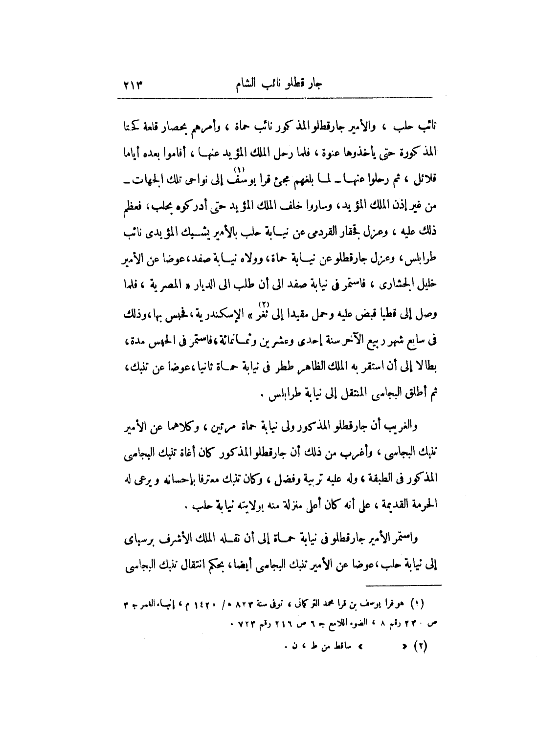 والغريب أن جار قطلو المذكور ولى نيابة حماة مرتين، وكلاهما عن الأمير تنبك البجاسى، وأغرب من ذلك أن جار قطلوا المذكور كان أغاة تنبك البجاسى المذكور في الطبقة، وله عليه تربية وفضل، وكان تنبك معترفاً بإحسانه ويرعى له الحرمة القديمة، على إنه كان أعلى منزلة منه بولايته نيابة حلب.