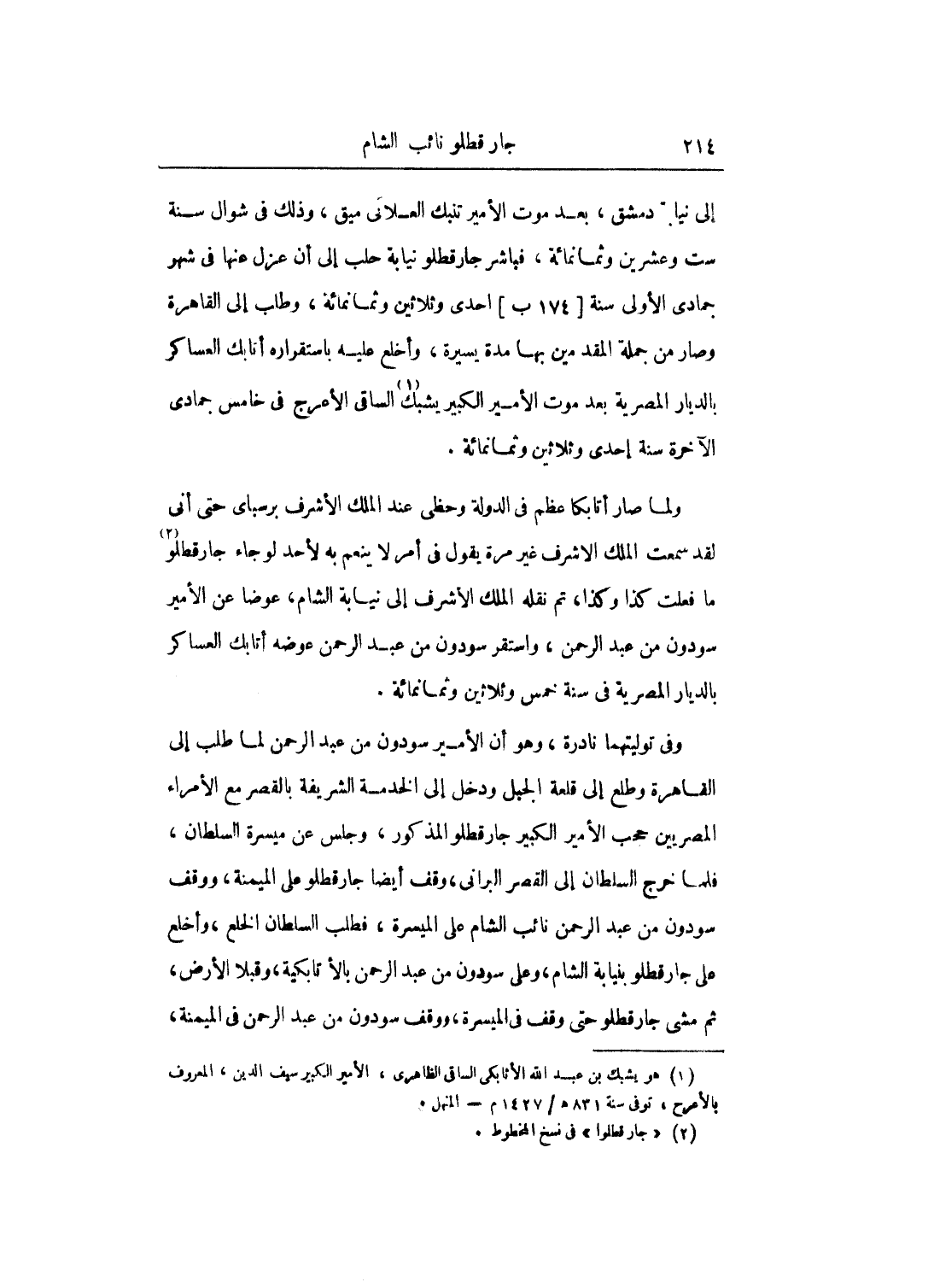 إلى دمشق، بعد موت الأمير تنبك العلائي ميق، وذلك في شوال سنة ست وعشرين وثمانمائة، فباشر جار قطلو نيابة حلب إلى أن عزل عنها في شهر جمادى الأولى سنة احدى وثلاثين وثمانمائة، وطلب إلى القاهرة وصار من جملة المقدمين بها مدة يسيرة، وأخلع عليه باستقراره أتابك العساكر بالديار المصرية بعد موت الأمير الكبير يشبك الساقى الأعرج في خامس جمادى الآخرة سنة أحدى وثلاثين وثمانمائة.