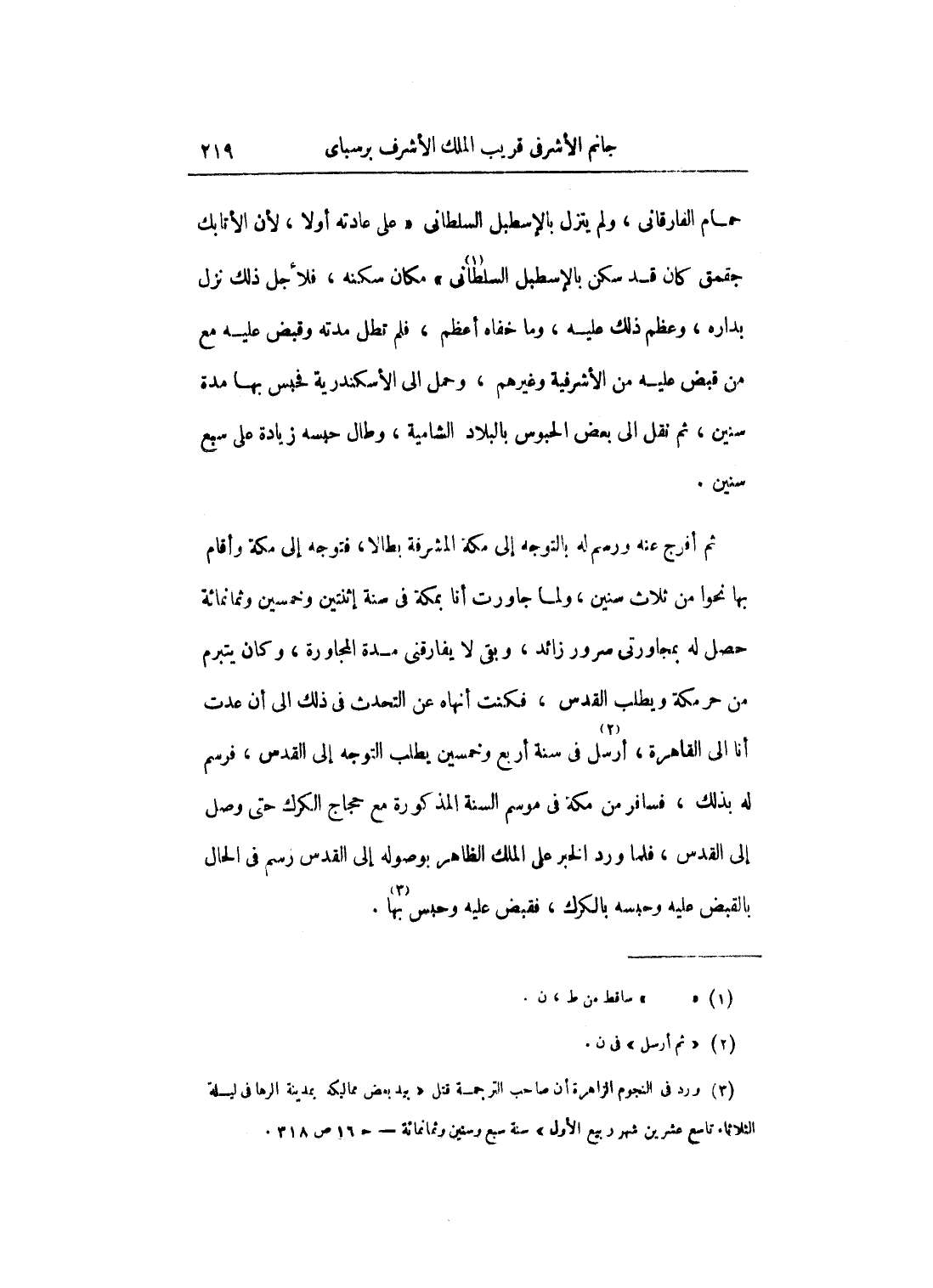 حمام الفارقانى، ولم ينزل بالإسطبل السلطاني، على عادته أولاً، لأن الأتابك جقمق كان قد سكن بالإسطبل السلطاني، مكان سكنه، فلا جل ذلك نزل بداره، وعظم ذلك عليه، وما خفاه أعظم، فلم تطل مدته وقبض عليه مع من قبض عليه من الأشرفية وغيرهم، وحمل إلى الأسكندرية فحبس بها مدة سنين، ثم نقل إلى بعض الحبوس بالبلاد الشامية، وطال حبسه زيادة على سبع سنين.