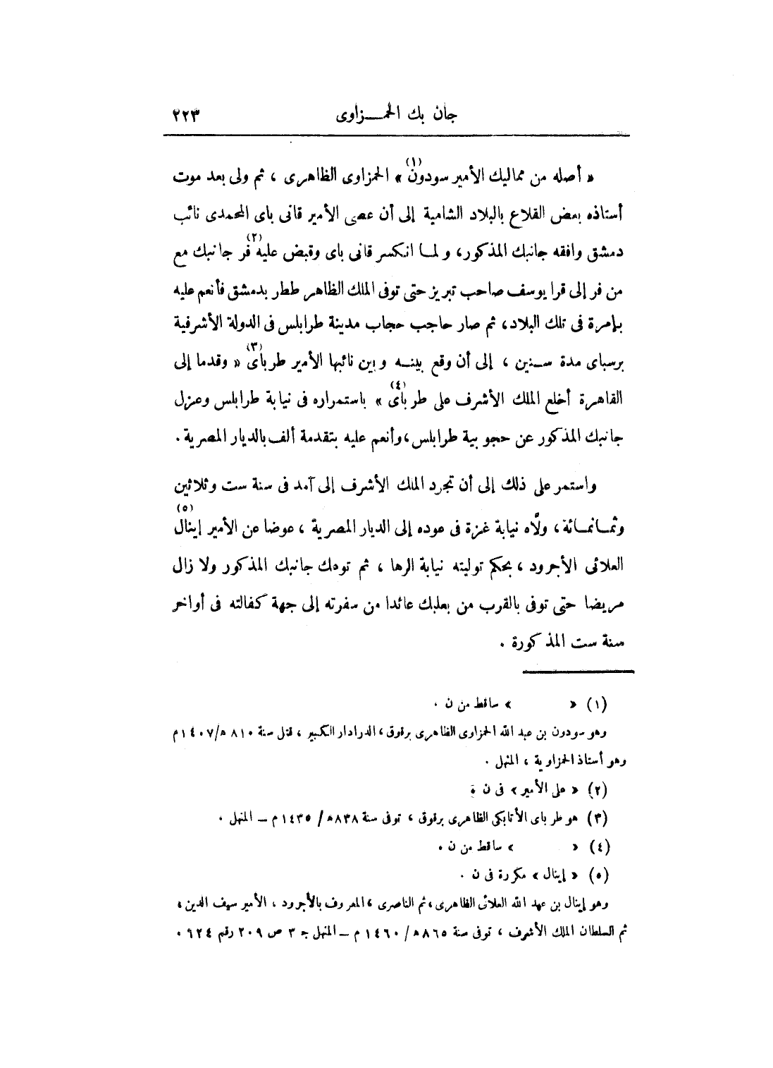واستمر على ذلك إلى أن تجرد الملك الأشرف إلى آمد في سنة ست وثلاثين وثمانمائة، ولاه نيابة غزة في عوده إلى الديار المصرية، عوضاً عن الأمير إينال العلائي الأجرود، بحكم توليته نيابة الرها، ثم توعك جانبك المذكور ولا زال مريضاً حتى توفي بالقرب من بعلبك عائداً من سفرته إلى جهة كفالته في أواخر سنة ست المذكورة.