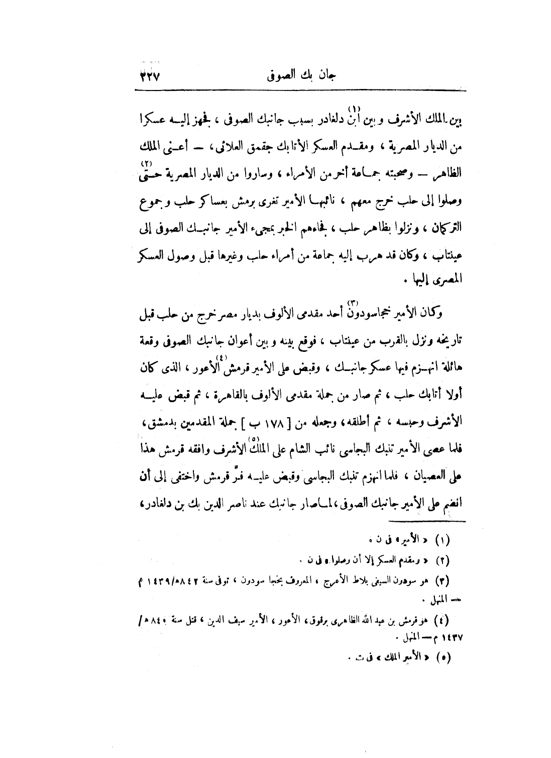 وكان الأمير خجا سودون أحد مدقمي الألوف بديار مصر خرج من حلب قبل تاريخه ونزل بالقرب من عينتاب، فوقع بينه وبين أعوان جانبك الصوفي وقعة هائلة انهزم فيها عسكر جانبك، وقبض على الأمير قرمش الأعور، الذي كان أولاً أتابك حلب، ثم صار من جملة مقدمي الألوف بالقاهرة، ثم قبض عليه الأشرف وحبسه، ثم صار من جملة مقدمي الألوف بالقاهرة، ثم قبض عليه الأشرف وحبسه، ثم أطلقه، وجعله من جملة المقدمين بدمشق، فلما عصى الأمير تنبك البجاسى نائب الشام على الملك الأشرف وافقه قرمش هذا على العصيان، فلما انهزم تنبك البجاسى وقبض عليه فرقرمش واختفى إلى أن انضم على الأمير جانبك الصوفي، لما صار جانبك عند ناصر الدين بك بن دلغادر،