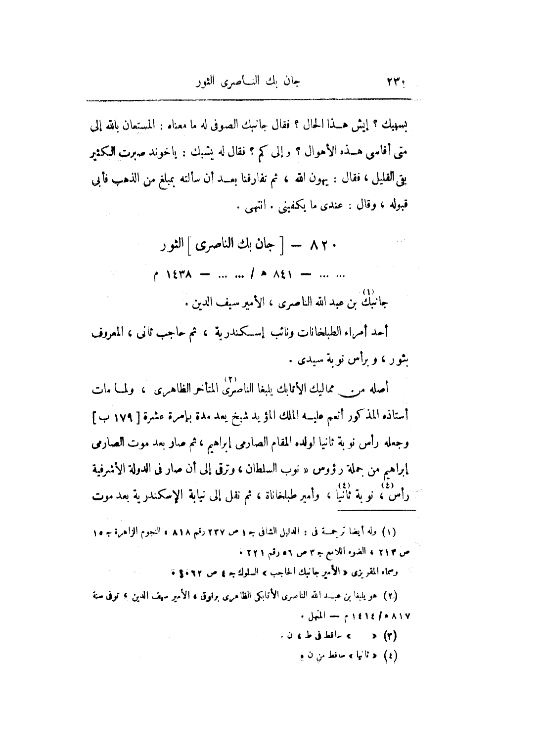 بسنبك؟ إيش هذا الحال؟ فقال جانبك الصوفي له ما معناه: المستعان بالله إلى متى أقاسي هذه الأهوال؟ وإلى كم؟ فقال له يشبك: يا خوند صبرت الكثير بقى القليل، فقال: يهون الله، ثم تفارقنا بعد أن سألته بمبلغ من الذهب فأبى قبوله، وقال: عندي ما يكفيني. انتهى.