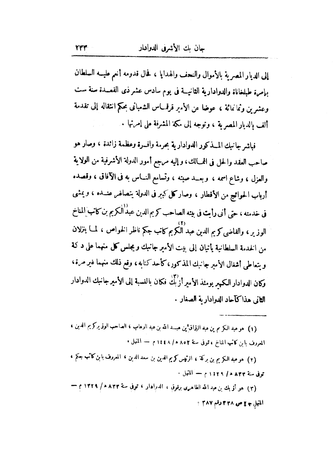 فباشر جنبك المذكور الدوادارية بحرمة وافرة وعظمة زائدة، وصار هو صاحب العقد والحل في الممالك، وإليه مرجع أمور الدولة الأشرفية من الولاية والعزل، وشاع اسمه، وبعد صيته، وتسامع الناس به في الآفاق، وقصده أرباب الحوائج من الأقطار، وصار كل كبير في الدولة يتصاغر عنده، ويمشي في خدمته، حتى أني رأيت في بيته الصاحب كريم الدين عبد الكريم بن كاتب المناخ الوزير، والقاضي كريم الدين عبد لكريم كاتب جكم ناظر الخواص، لما ينزلان من الخدمة السلطانية يأتيان إلى بيت الأمير جانبك ومجلس كل منهما على دكة ويتعاطى أشغال الأمير جانبك المذكور، كأحد كتابه، وقع ذلك منهما غير مرة، وكان الدوادار الطبير يومئذ الأمير أزبك فكان بالنسبة إلى الأمير جانبك الدوادار الثاني هذا كآحاد الدوادارية الصغار.
