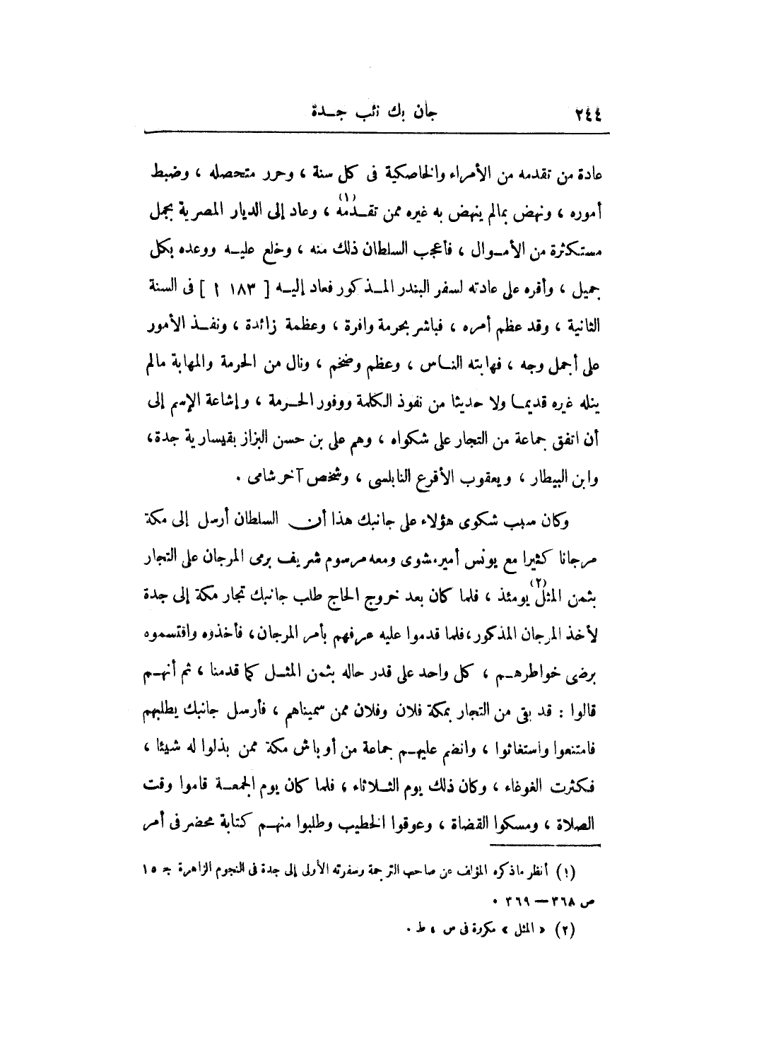 عادة من تقدمه من الأمراء والخاصكية في كل سنة، وحرر متحصله، وضبط أموره، نهض بمالم ينهض به غيره ممن تقدمه، وعاد إلى الديار المصرية بجمل مستكثرة من الأموال، فأعجب السلطان ذلك منه، وخلع عليه ووعده بكل جميل، وأقره على عادته لسفر البندر المذكور فعاد إليه في السنة الثانية، وقد عظم أمره، فباشر بحرمة وافرة، وعظمه زائدة، ونفذ الأمور على أجمل وجه، فهابته الناس، وعظم وضخم، ونال من الحرمة والمهابة مالم ينله غيره قديماً ولا حديثاً من نفوذ الكلمة ووفور الحرمة، وإشاعة الإسم إلى أن اتفق جماعة من التجار على شكواه، وهم على بن حسن البزاز بقيسارية جدة، وابن البيطار، ويعقوب الأقرع النابلسى، وشخص آخر شامي.