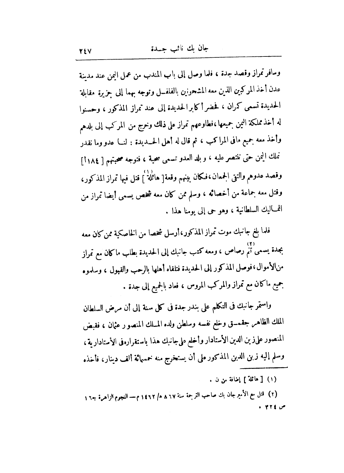 وسافر تمراز وقصد جدة، فلما وصل إلى باب المندب من عمل اليمن عند مدينة عدن أخذ المركبين الذين معه المشحونين بالفلفل وتوجه بهما إلى جزيرة مقابلة الحديدة تسمى كمران، فحضر أكابر الحديدة إلى عند تمراز المذكور، وحسنوا له أخذ معه جمعي ما في المراكب، ثم قال له أهل الحديدة: لنا عدو وما نقدر نملك اليمن حتى ننتصر عليه، وبلد العدو تسمى سحية، فتوجه صحبتهم وقصد عدوهم والتقى الجمعان، فكان بينهم وقعة هائلة قتل فيها تمراز المذكور، وقتل معه جماعة من اخصائه، وسلم ممن كان معه شخص يسمى أيضاً تمراز من المماليك السلطانية، وهو حي إلى يومنا هذا.