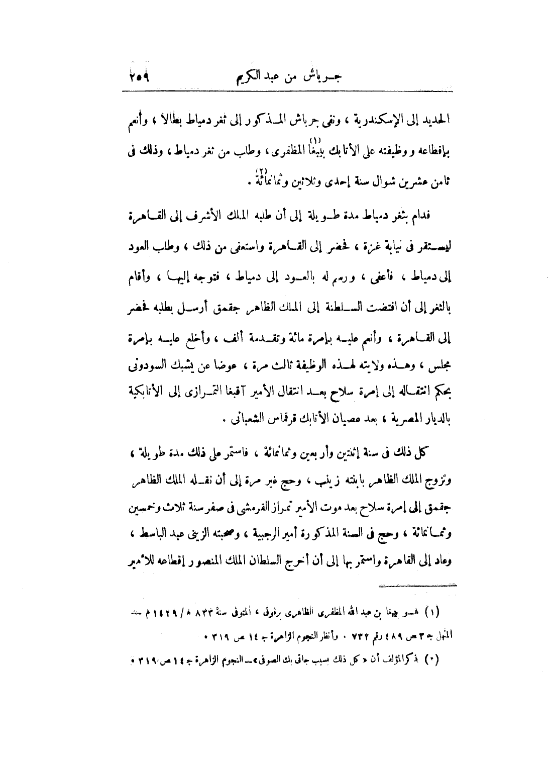 الحديد إلى الإسكندرية، ونفى جرباش المذكور إلى ثغر دمياط بطالاً، وأنعم بإقطاعه ووظيفته على الأتابك بيبغا المظفرى، وطلب من ثغر دمياط، وذلك في ثامن عشرين شوال سنة إحدى وثلاثين وثمانمائة.