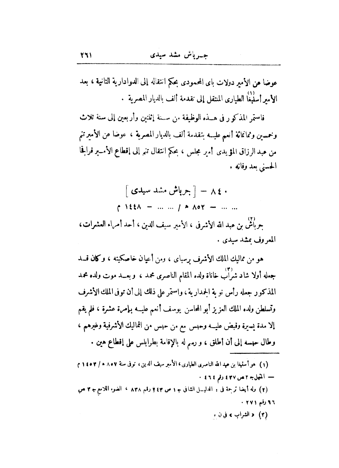 فاستمر المذكور في هذه الوظيفة من سنة إثنتين وأربعين إلى سنة ثلاث وخمسين وثمانمائة أنعم عليه بتقدمة ألف بالديار المصرية، عوضاً عن الأمير تنم من عبد الرزاق المؤيدي أمير مجلس، بحكم انتقال تنم إلى إقطاع الأمير قراقجا الحسنى بعد وفاته.
