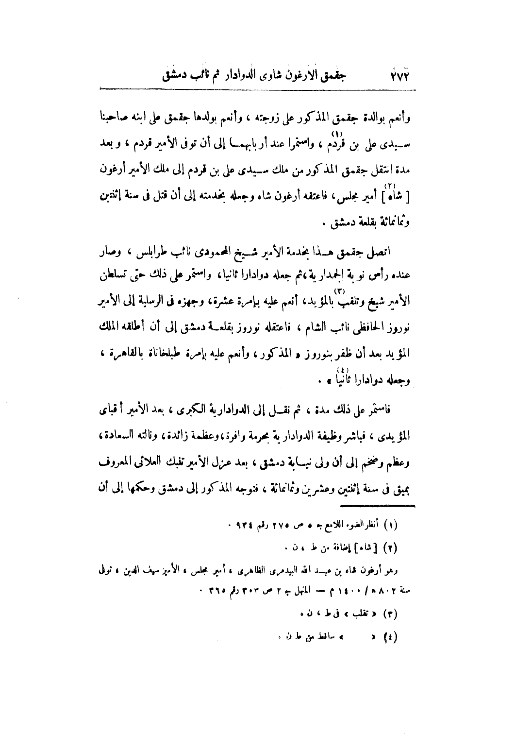 وأنعم بوالده جقمق المذكور على زوجته، وأنعم بولدها جقمق على ابنه صاحبنا سيدي علي بن قردم، واستمرا عند أربابهما إلى أن توفي الأمير قردم، وبعد مدة انتقل جقمق المذكور من ملك سيدي على بن قردم إلى ملك الأمير أرغون شاه أمير مجلس، فاعتقه أرغون شاه وجعله بخدمته إلى أن قتل في سنة إثنتين وثمانمائة بقلعة دمشق.