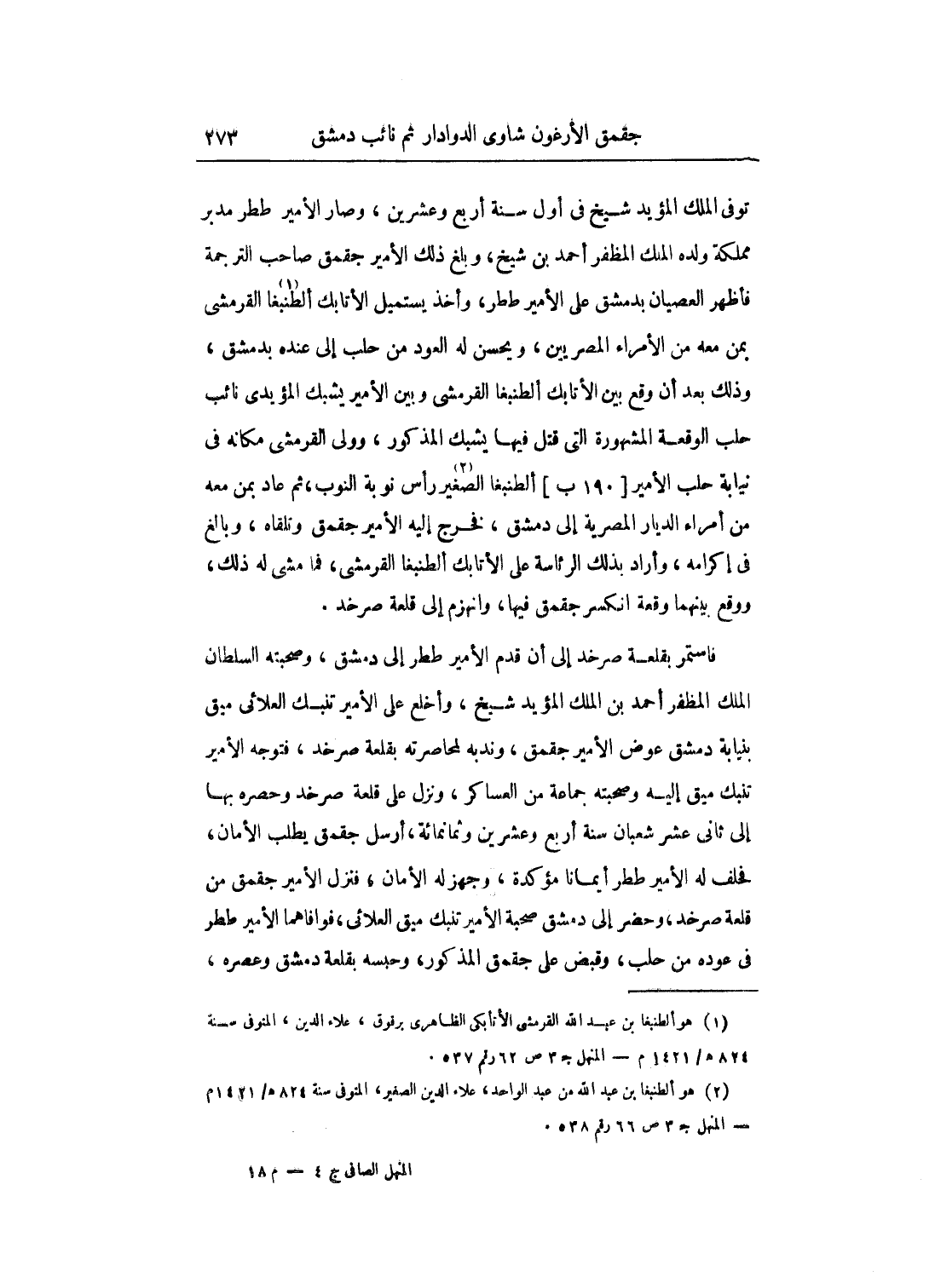 توفى الملك المؤيد شيخ في أول سنة أربع وعشرين، وصار الأمير ططر مدبر مملكة ولده الملك المظفر أحمد بن شيخ، وبلغ ذلك الأمير جقمق صاحب الترجمة فأظهر العصيان بدمشق على الأمير ططر، وأخذ يستميل الأتابك ألطنبغا القرمشى بمن معه من الأمراء المصريين، ويحسن له العود من حلب إلى عنده بدمشق، وذلك بعد أن وقع بين الأتابك ألطنبغا القرمشى وبين الأمير يشبك المؤيدي نائب حلب الوقعة المشهورة التي قتل فيها يشبك المذكور، وولى القرمشى مكانه في نيابة حلب الأمير ألطنبغا الصغير رأس نوبة النوب، ثم عاد بمن معه من أمراء الديار المصرية إلى دمشق، فخرج إليه الأمير جقمق وتلقاه، وبالغ في إكرامه، وأراد بذكل الرئاسة على الأتابك ألطنبغا القرمشى، فما مشى له ذلك، ووقع بينهما وقعة انكسر جقمق فيها، وانهزم إلى قلعة صرخد.