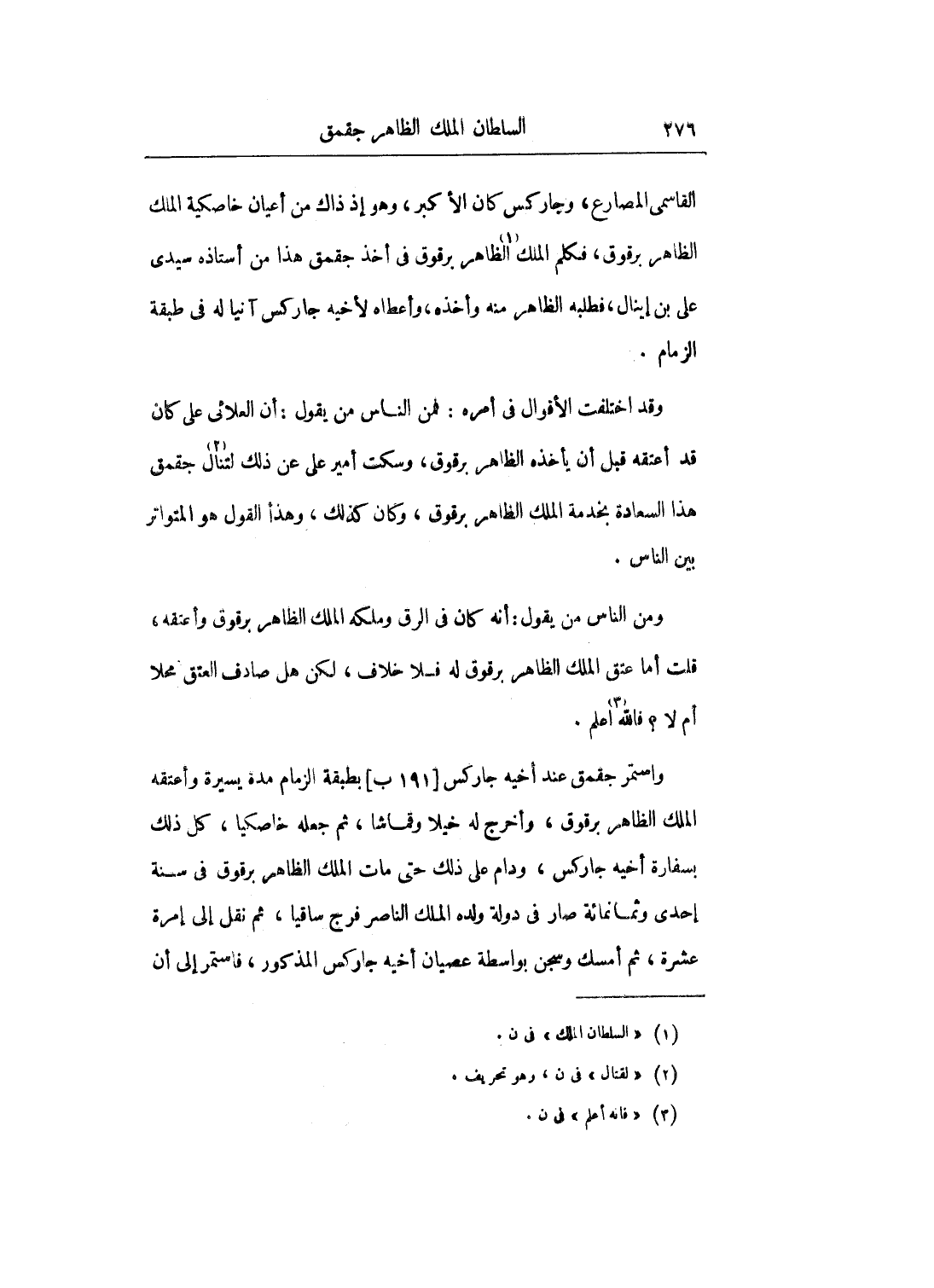 ومن الناس من يقول: أنه كان في الرق وملكه الملك الظاهر برقوق وأعتقه، قلت أما عتق الملك الظاهر برقوق له فلا خلاف، لكن هل صادف العتق محلا أم لا؟ فالله أعلم.