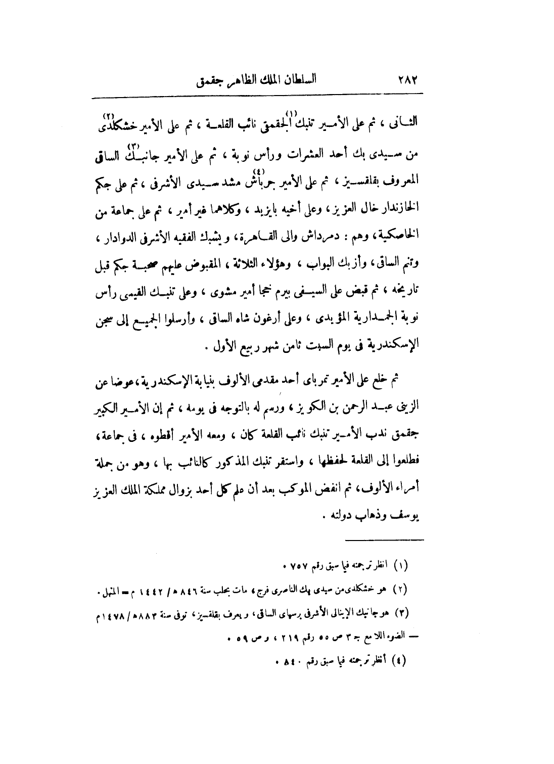 الثاني، ثم على الأمير تنبك الجقمقي نائب القلعة، ثم على الأمير خشكلدى من سيدي بك أحد العشرات ورأس نوبة، ثم على الأمير جانبك الساقي المعروف بقلقسيز، ثم على الأمير جرباش مشد سيدي الأشرفي، ثم على جكم الخازندار خال العزيز، وعلى أخيه بايزيد، وكلاهما غير أمير، ثم على جماعة من الخاصكية، وهم: دمرداش وإلى القاهرة، ويشبك الفقيه الأشرفي الدوادار، وتنم الساقي، وأزبك البواب، وهؤلاء الثلاثة، المقبوض عليهم صحبة جكم قبل تاريخه، ثم قبض على السيفى بيرم خجا أمير مشوى، وعلى تنبك القيسى رأس نوبة الجمدارية المؤيدي، وعلى أرغون شاه الساقي، وأرسلوا الجميع إلى سجن الإسكندرين في يوم السبت ثامن شهر ربيع الأول.