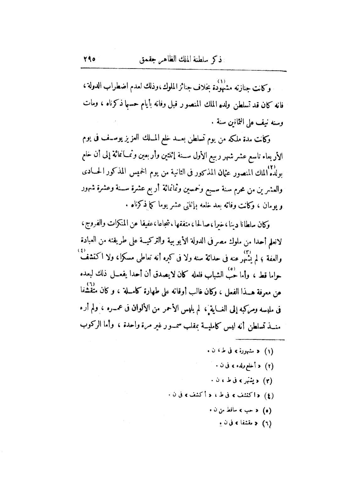 وكان سلطاناً ديناً، خيراً، صالحاً، متفقهاً، شجاعاً، عفيفاً عن المنكرات والفروج، لا نعلم أحدا من ملوك مصر في الدولة الأيوبية والتركية على طريقته من العبادة والعفة؛ لم يشهر عنه في حداثة سنه ولا في كبره أنه تعاطى مسكراً، ولا اكتشف حراماً قط، وأما حب الشباب فلعله كان لا يصدق أن أحداً يفعل ذلك لبعده عن معرفة هذا الفعل، وكان غالب أوقاته على طهارة كاملة، وكان متقشفاً في ملبسه ومركبه إلى الغاية، لم يلبس الأحمر من الألوان في عمره، ولم أراه منذ تسلطن أنه لبس كاملية بمقلب سمور غير مرة واحدة، وأما الركوب